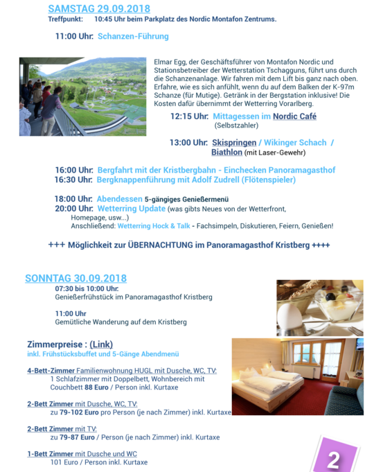 Am späteren Nachmittag gehts hinein ins schöne Silbertal und mit der Seilbahn oder mit dem Auto hinauf auf den Kristberg (1.400m). Dort warten auf uns nach einer interessanten Bergknappenführung ein kulinarisches Abendmenü beim Wetterstationsbetreiber Jürgen Zudrell und seinem Team vom Panoramagasthof Kristberg. Geselligkeit sowie spannende Gespräche über Wetter und Klima sind garantiert und natürlich gibt es bei den Zudrells extra fürs Wetterring-Treffen reservierte Zimmer zur Übernachtungen (max. 20 Personen).