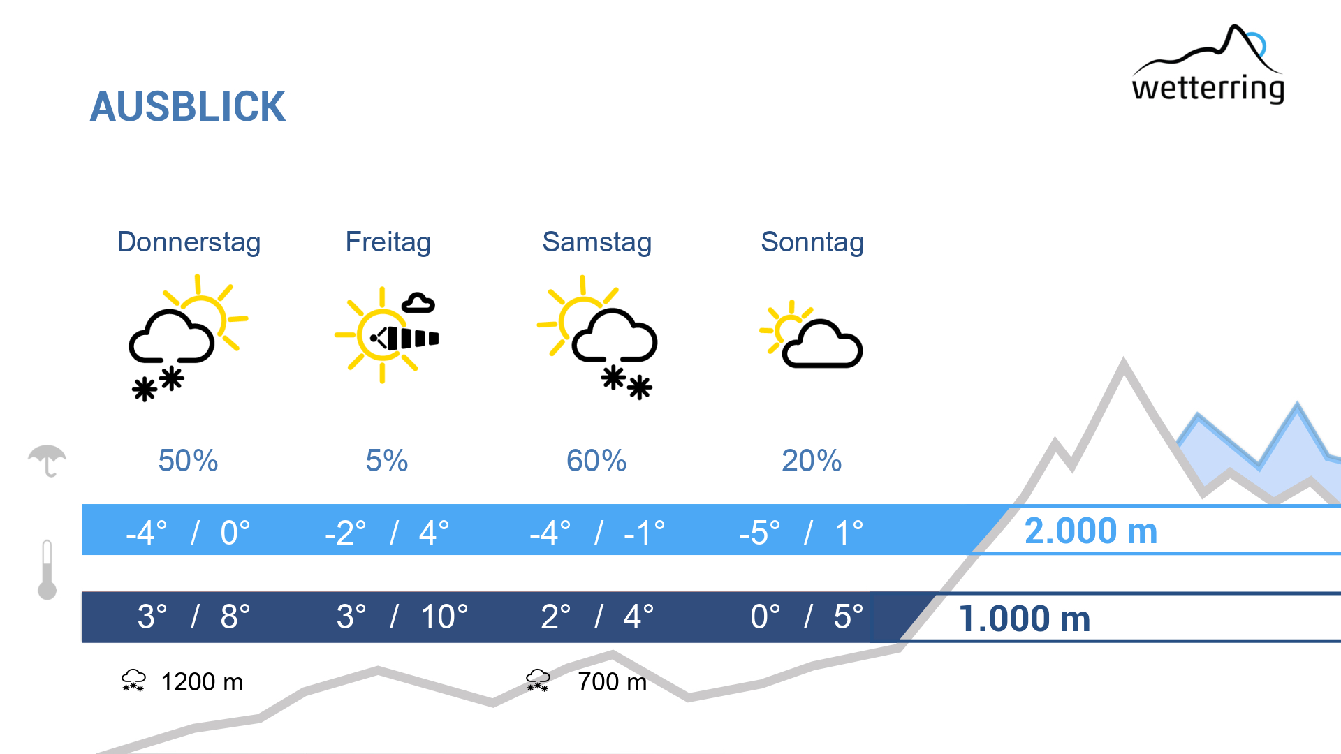 In der Nacht zum Donnerstag kann es leicht regnen, oberhalb von 1500-1200 m fallen Flocken.