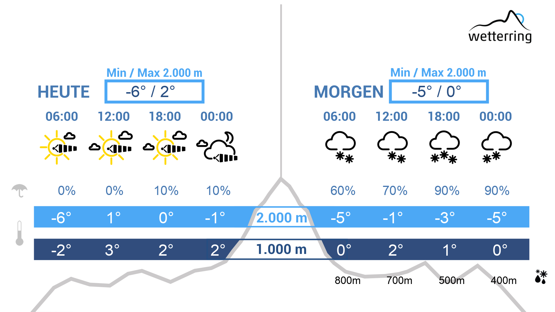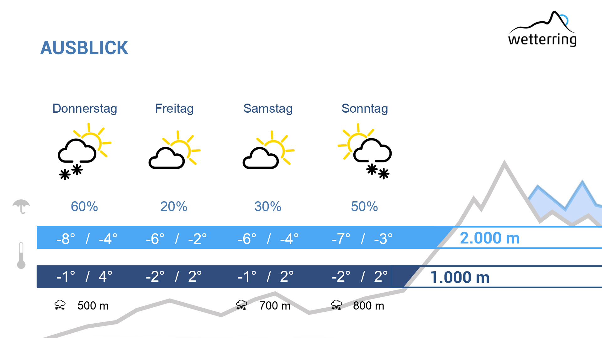 Am Donnerstag halten sich zunächst viele Wolken und am Vormittag gibt es noch etwas Schneefall, unterhalb von 600-500 m Schneeregen oder Regen. Am Nachmittag bessert sich das Wetter und es stellt sich dann ein trockener Mix aus sonnigen Abschnitten und harmlosen Wolkenfeldern ein.