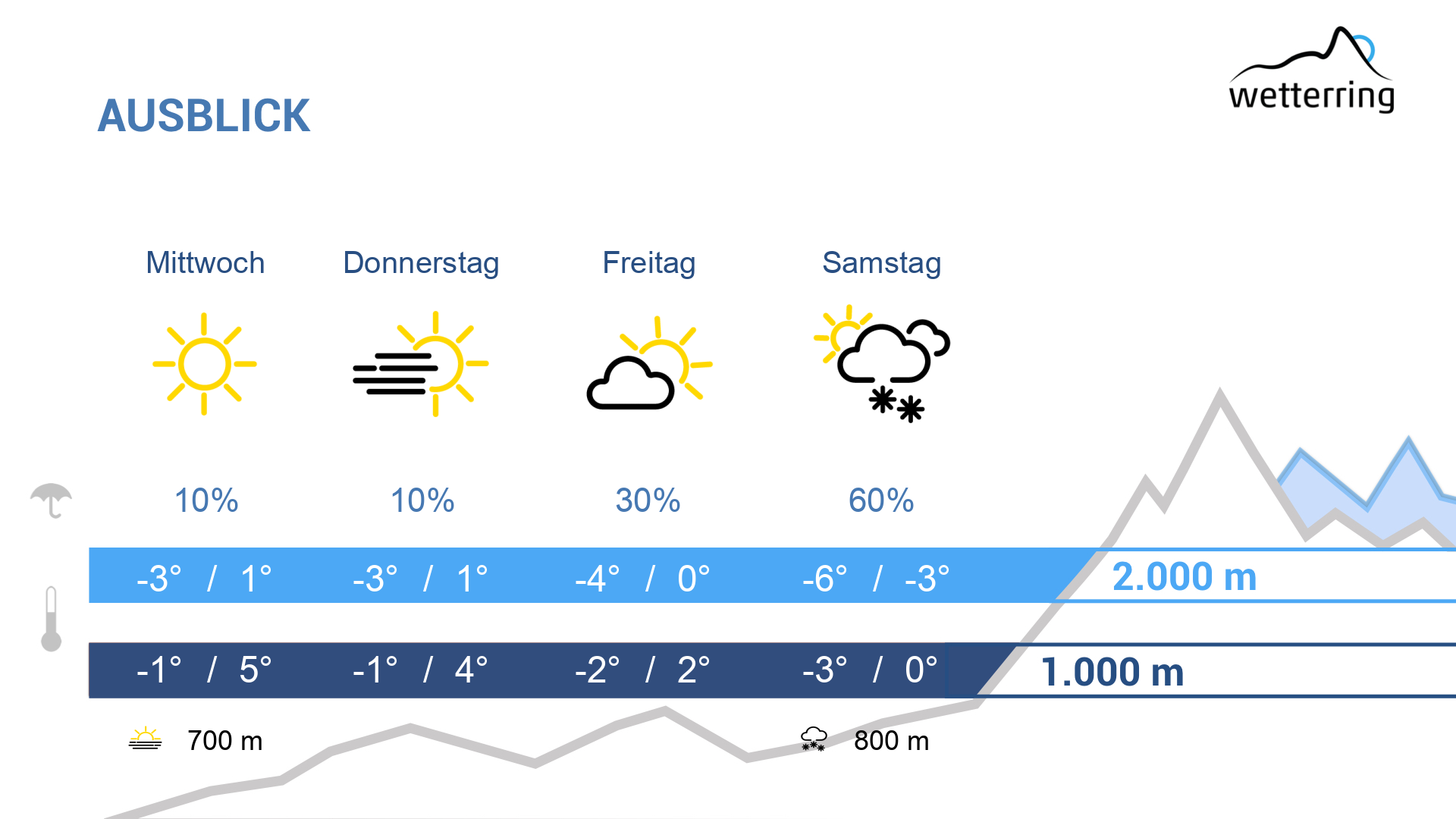 Für Samstag noch unsichere Prognose. Vermutlich überquert uns in der Früh und am Vormittag eine Störung, welche für einige Regenschauer oder oberhalb von 700-900 Metern Schneeschauer sorgt. Zum Nachmittag lockern die Wolken auf und es setzt sich noch für einige Zeit die Sonne durch.