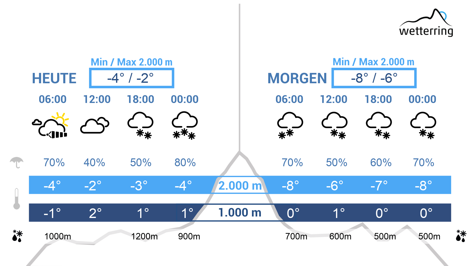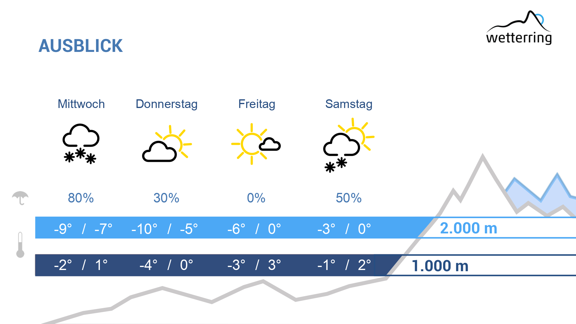 Am Donnerstag deutliche Wetterbesserung. In der Früh fallen aus dichten Wolken hie und da noch letzte Flocken, im weiteren Tagesverlauf lockern die Wolken aber immer öfter auf. Mit der einen oder anderen Sonnenstunde steigen die Temperaturen im Rheintal noch bis auf rund 3 Grad an. Im Gebirge oberhalb von 1000 Metern herrscht Dauerfrost.