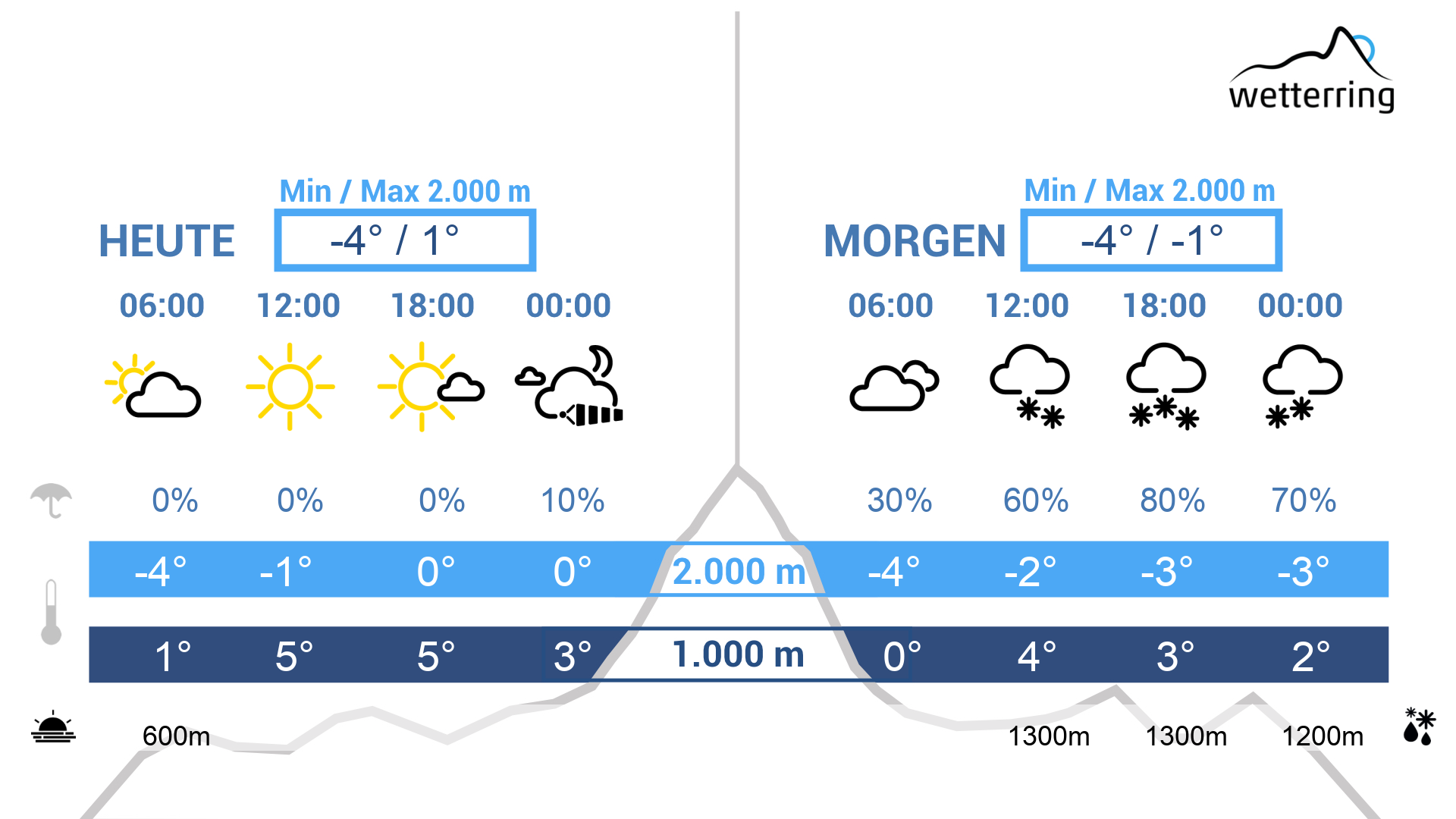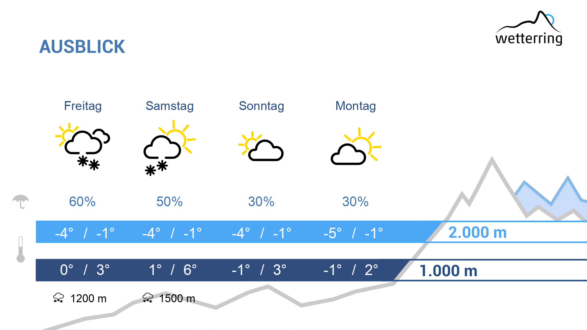 Am Freitag setzten mit einer Front Niederschläge ein bei einer Schneefallgrenze von ca. 1200m. Es bleibt aber in allen Höhenlagen zu mild für die Jahreszeit, kräftiger Westwind in den Bergen!
