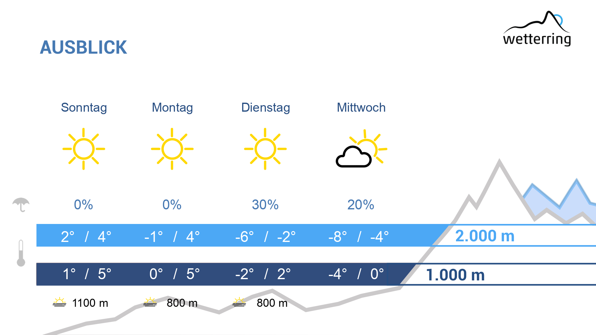 Am Sonntag weiterhin hochdruckbestimmtes Winterwetter. Dazu wird die Bise (Ostwind) wieder etwas stärker und lässt den Hochnebel auf über 1000 Meter ansteigen. Zwar zeigt sich hie und da auch in den Tallagen die Sonne, besonders in Richtung des Bodensees könnte sich der Hochnebel aber vorübergehend wieder hartnäckig halten.