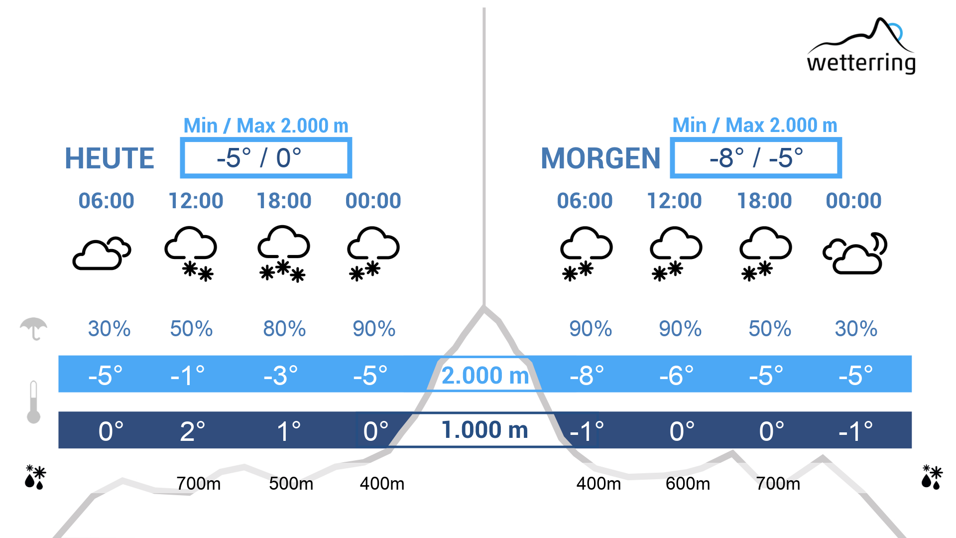 Am Donnerstag halten sich dichte Wolken und besonders am Vormittag schneit es noch verbreitet, meist bis in die tiefsten Lagen. Am Nachmittag legt der Schneefall vermehrt Pausen ein und geht unterhalb von 600-700 m in Regen über. Der Abend verläuft meist schon trocken.