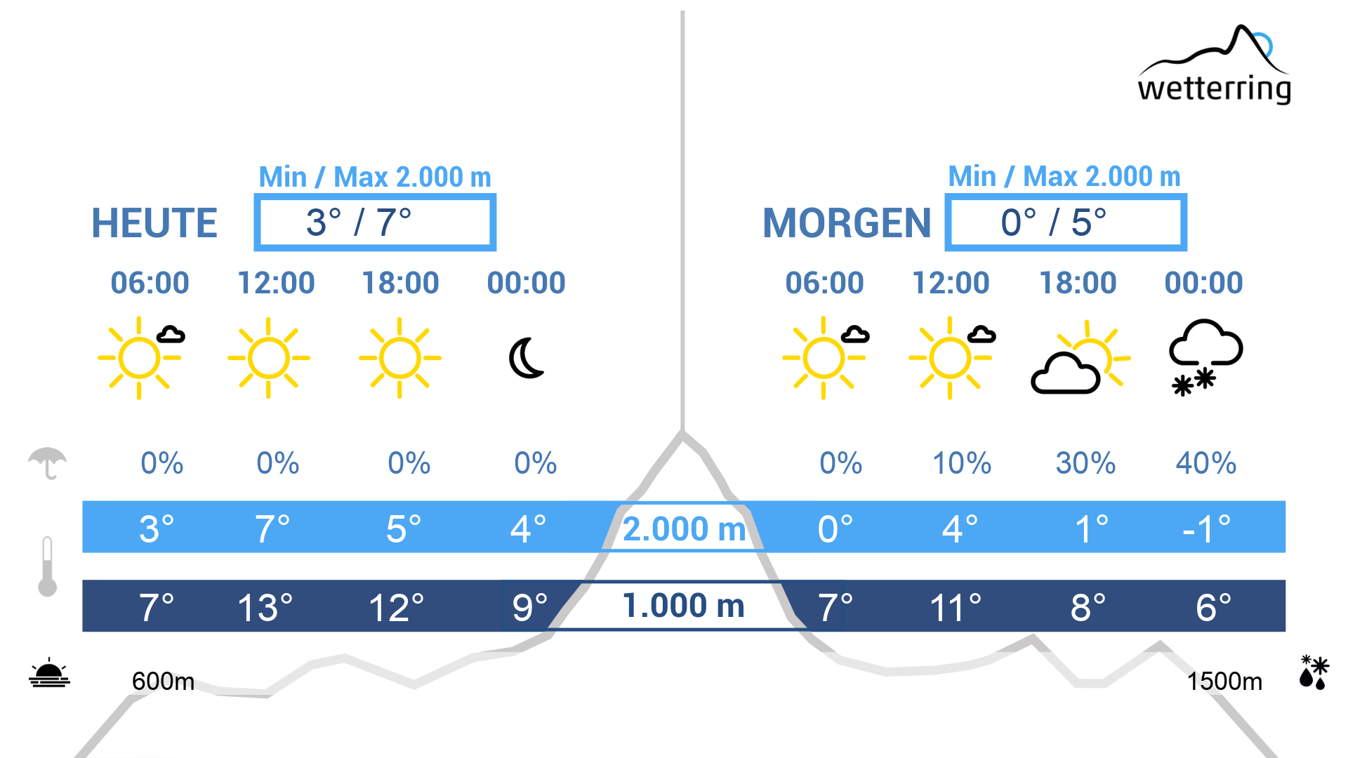 Am Samstag meist freundlich, allmählich aber etwas unbeständiger. In der Früh scheint die Sonne noch zum Teil ungetrübt vom Himmel, ehe allmählich erste Wolken einer schwachen Kaltfront aufziehen. Diese verdichten sich zum Abend hin weiter und sorgen am Abend und in der Nacht auf Sonntag für einzelne unergiebige Schauer. Die Schneefallgrenze liegt dazu auf rund 1500 Metern.