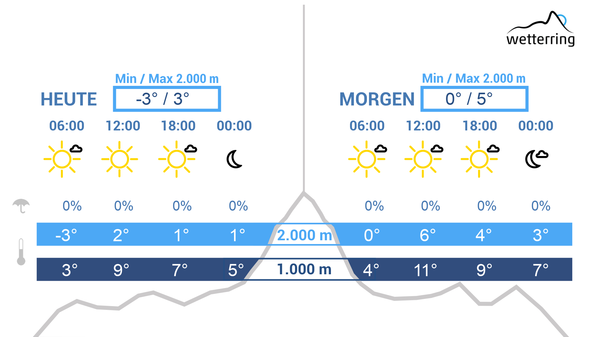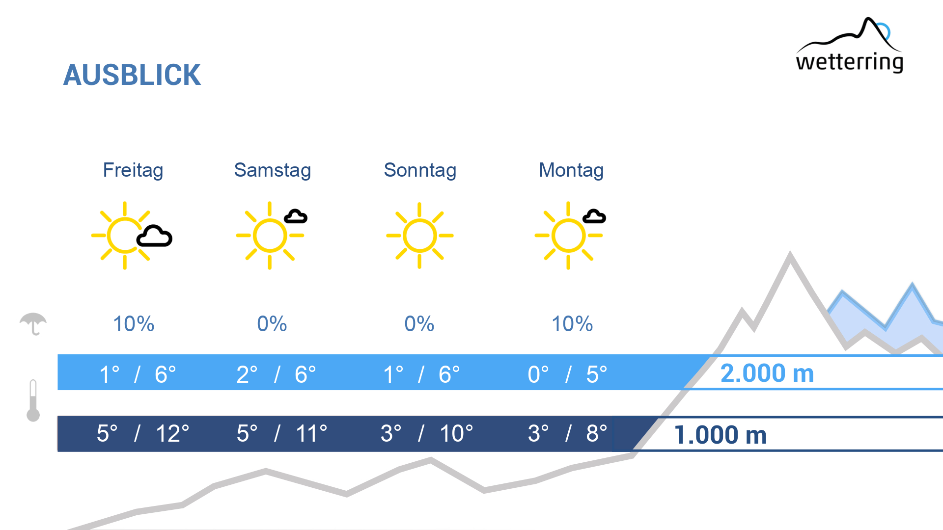 Am Donnerstag ungetrübt sonniges Hochdruckwetter und frühlingshaft mild mit Höchstwerten bis zu 16 °C im Rheintal und selbst in 2.000 m bis zu 6 Grad. Dazu im Gebirge leicht föhnig.