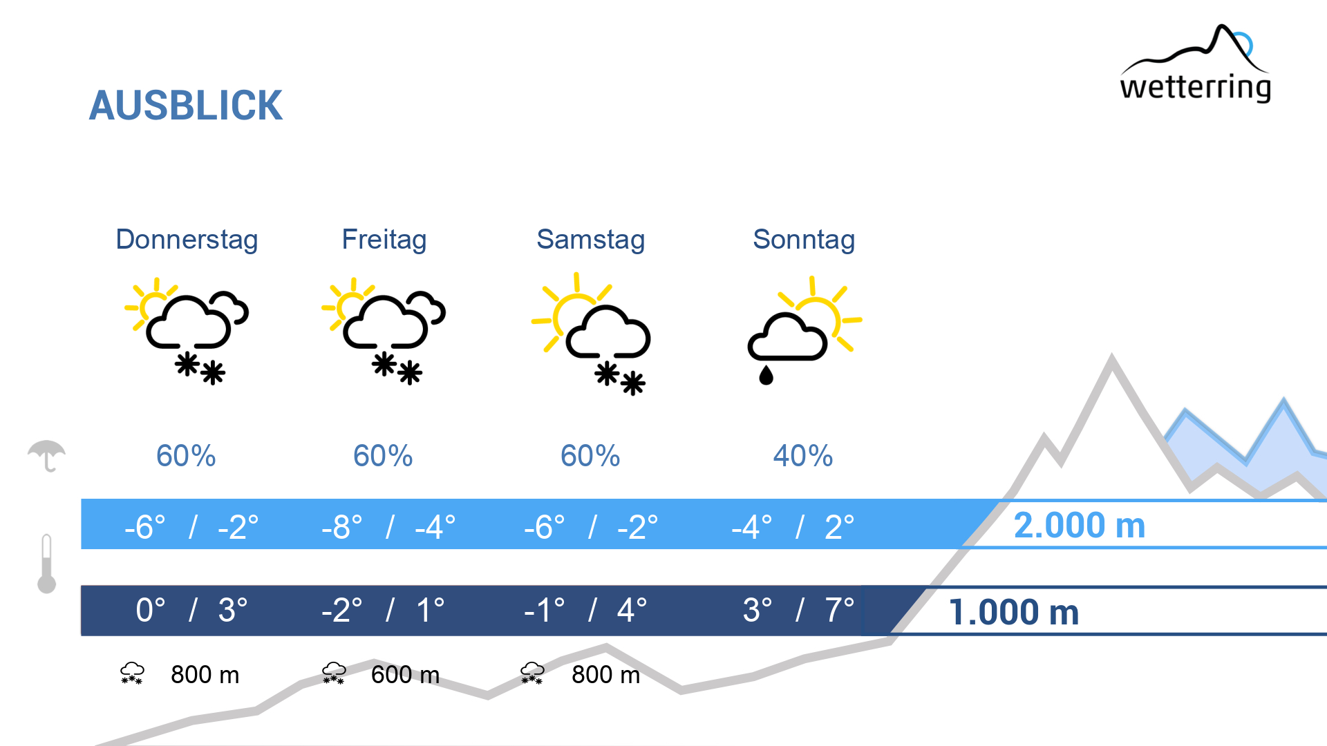 Nach einem kurzen Föhnintermezzo in den frühen Morgenstunden bricht der Südwind langsam zusammen und wird von dichten Wolken und aufkommenden Niederschlägen abgelöst. Untertags allmählich kühler und somit sinkende Schneefallgrenze.