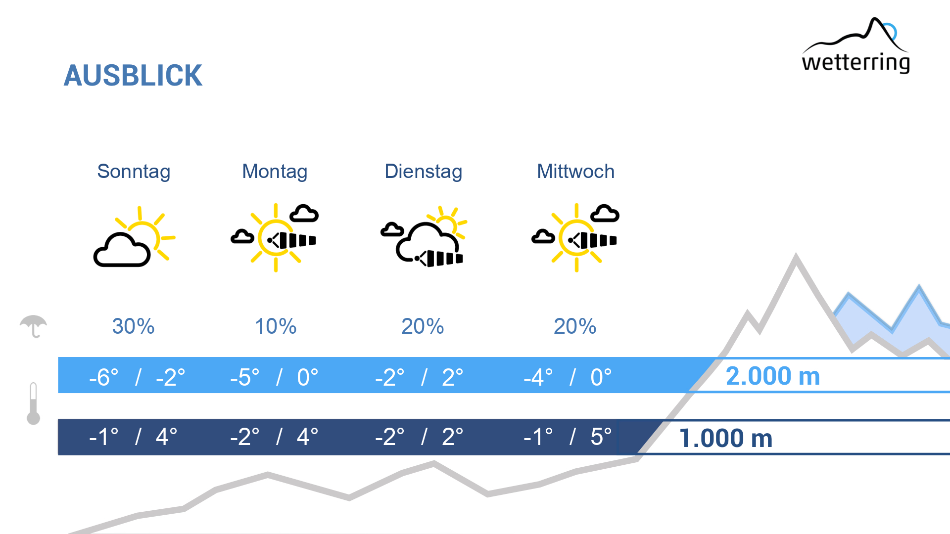 Der Montag wird überwiegend sonnig und mit teils lebhaftem Föhnwind wird es mild, der in den Kammlagen und Föhngebieten stürmisch wehen kann. Die Höchstwerte liegen in den NIederungen meist zwischen 5 und 10 Grad. Bis zu 13 °C gibt es in manchen Föhnstrichen und In 2000 m um 0 Grad.