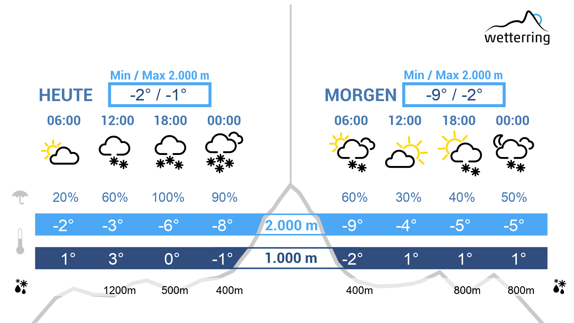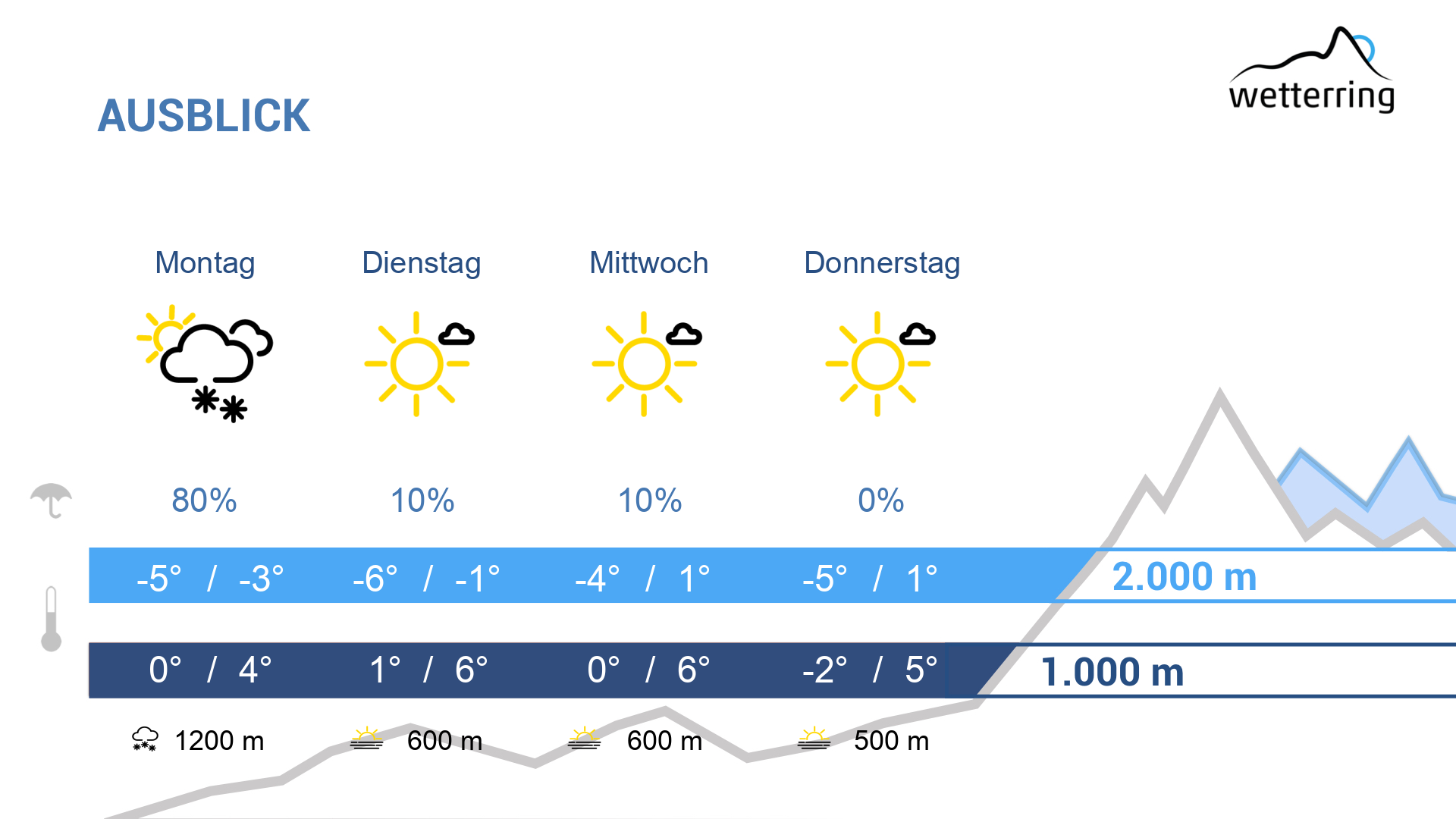 Die Temperaturen erreichen in sonnigen Phasen bis zu 9 Grad im Rheintal und liegen auf 2000 m um -3 Grad.