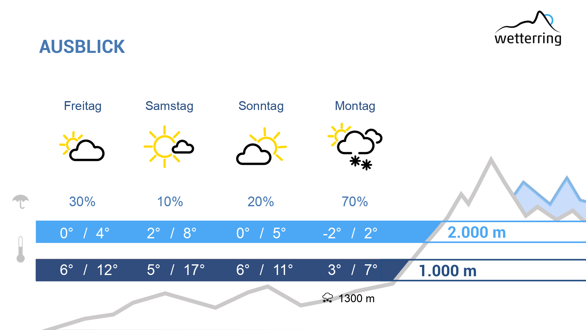 Die neue Woche startet kühl und vermutlich nass. Schnee ab ca. 1000 - 1300 m. Danach gibt es der Jahreszeit entsprechende Werte und wechselhaftes Wetter.