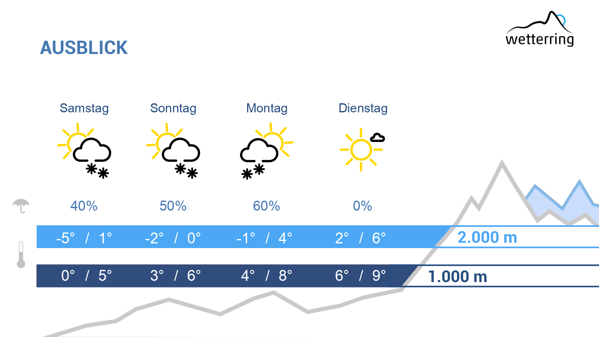 Am Sonntag ein Mix aus sonnigen Abschnitten, einigen Wolken und vereinzelt auch kurzen Regenschauern, wobei die Schneefallgrenze um 1.500 -1.800 m liegen dürfte.