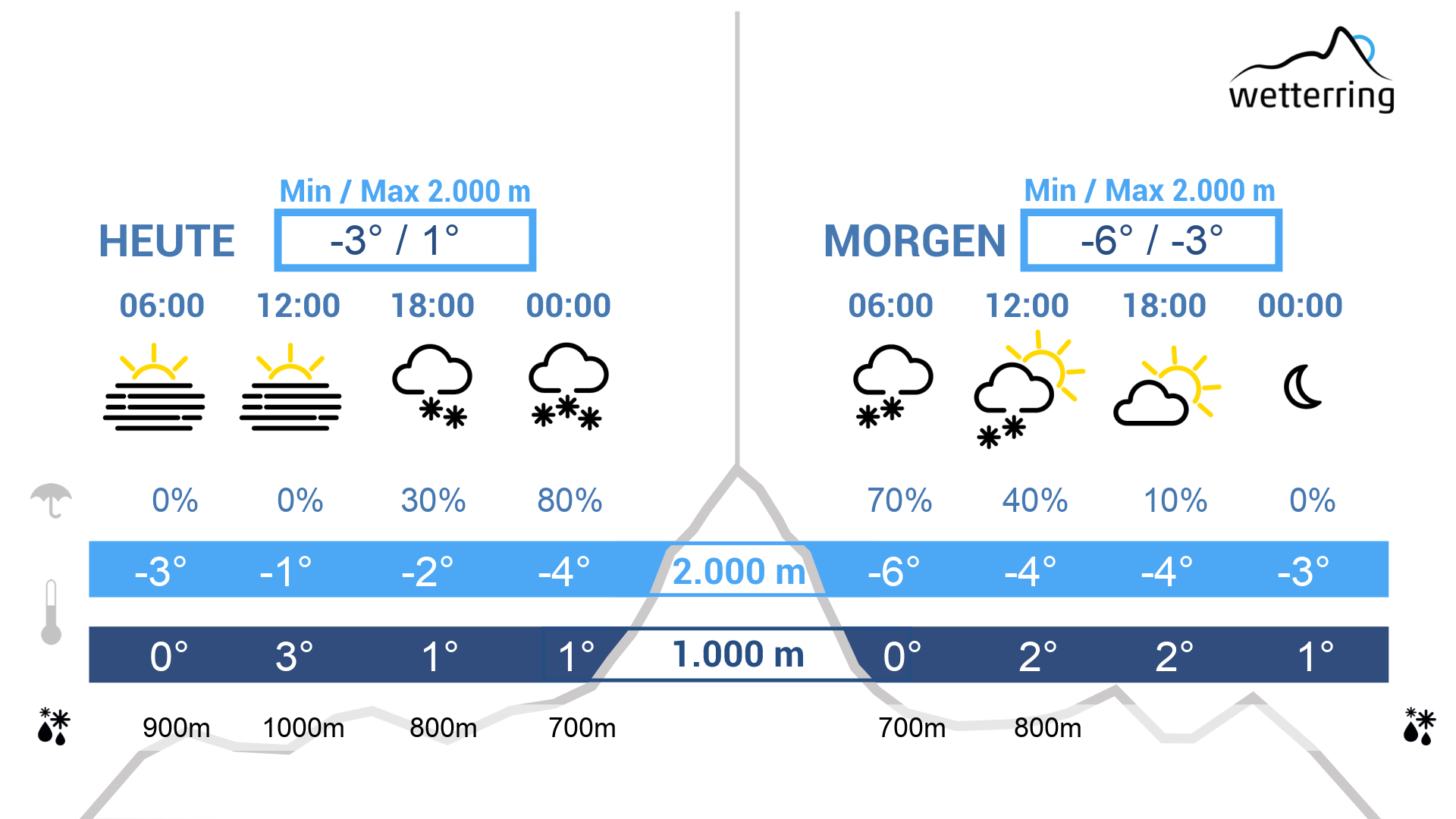 Am Donnerstag Hochnebel über den Niederungen, Sonnenschein mit aufziehenden hohen Wolkenfeldern in den Bergen oberhalb von ca. 1000 m. Dazu in allen Höhenlagen winterlich kalt. In den späten Abend- bzw. Nachtstunden auf den Freitag beginnt es aus den Bergen heraus leicht bis mäßig zu schneien. Die Schneefallgrenze liegt inneralpin bei 600 m, im Rheintal bei ca. 900 m.