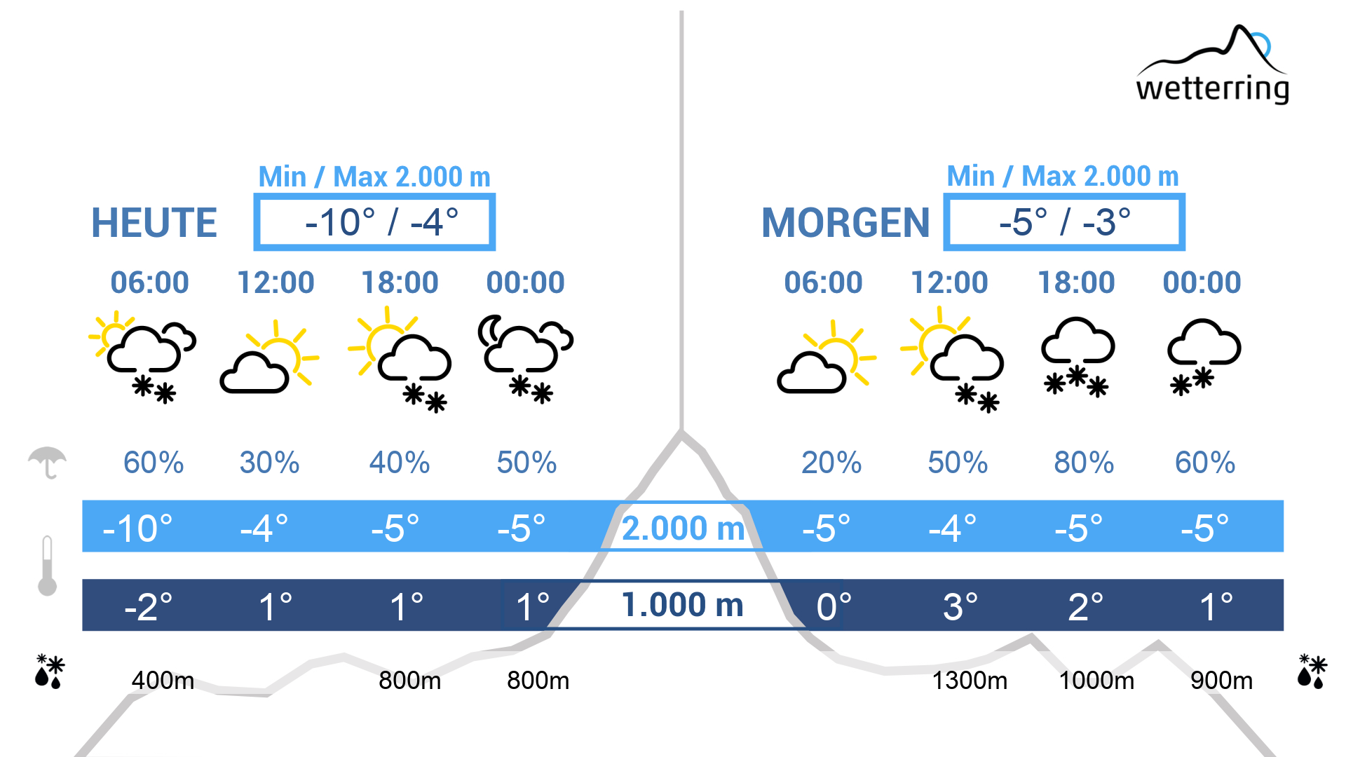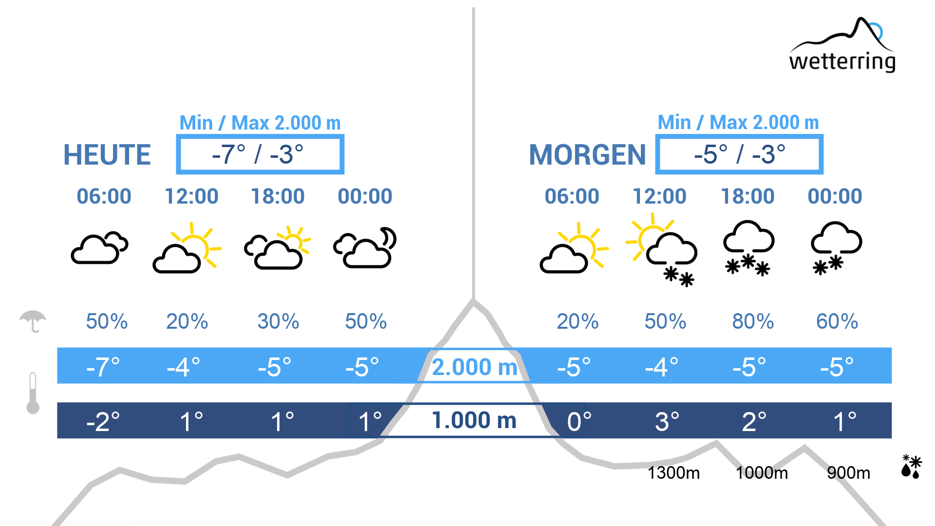 Der Montag verläuft wechselhaft mit zunächst aufgelockerten bzw. kurzen sonnigen Phasen während der 1. Tageshäldfte. Dazu maximal bis 11 Grad im Rheintal und um 4 Grad auf 1000 m Höhe. Im Gebirge weht zudem starker Westwind bei durchwegs frostigen Temperaturen! Gegen späten Nachmittag / Abend werden die Wolken generell dichter und es setzt leichter Regen, oberhalb von ca. 1100 Meter Schneefall ein.