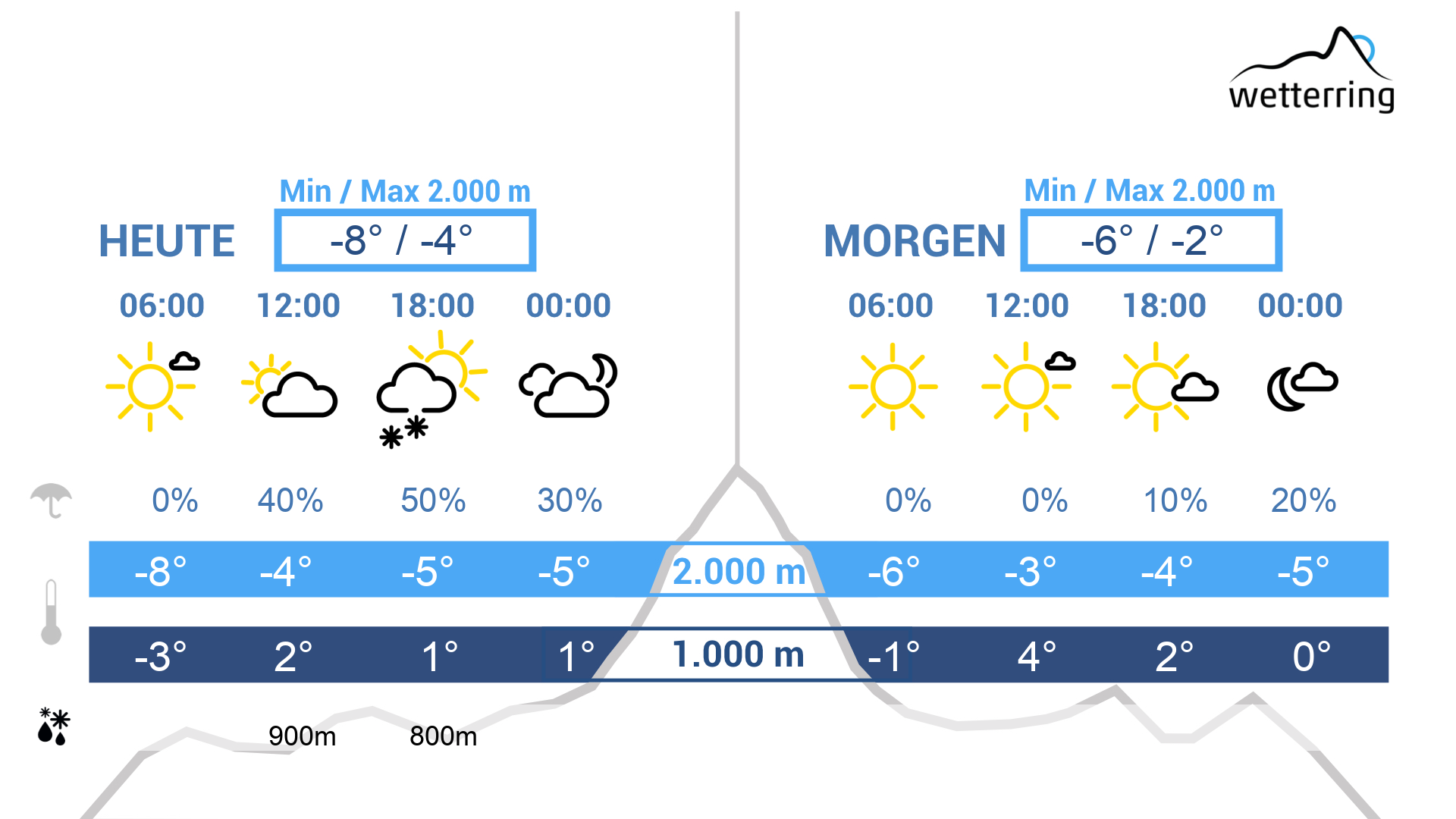 Am Vormittag gibt es einen freundlichen Mix aus Sonnenschein und aufziehenden hohen Schleierwolken. Am Nachmittag werden die Wolken von Südwesten her dichter und es kann vorzüglich in den Bergen etwas schneien. Unterhalb von 700-900 m kann es leicht regnen.