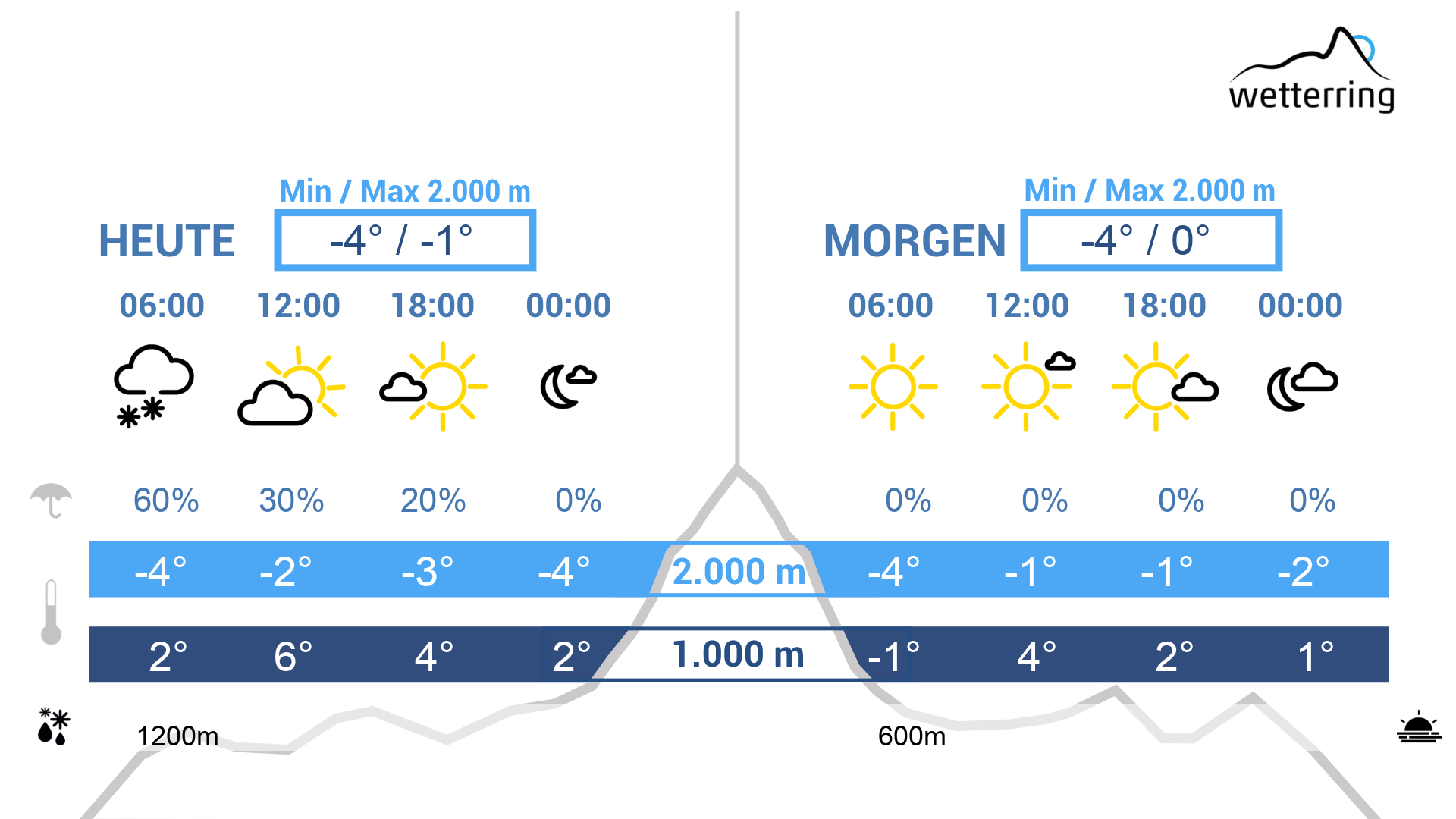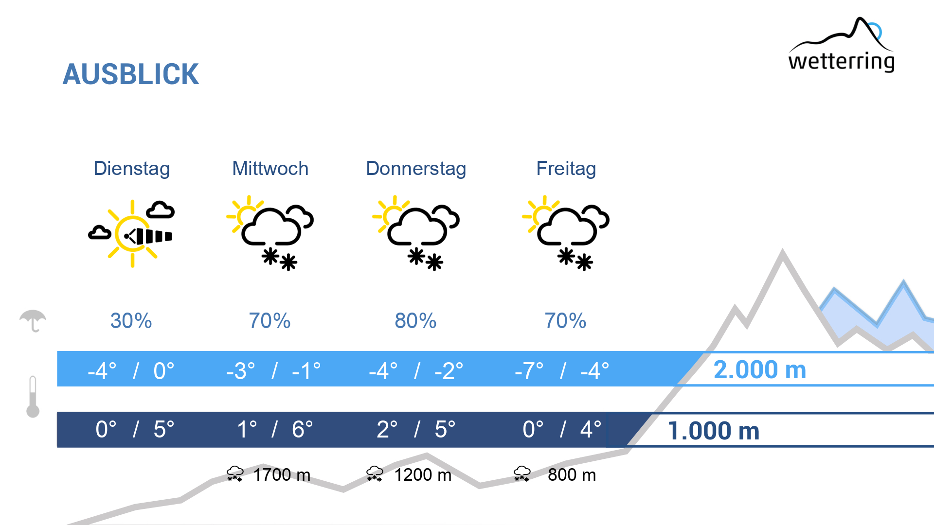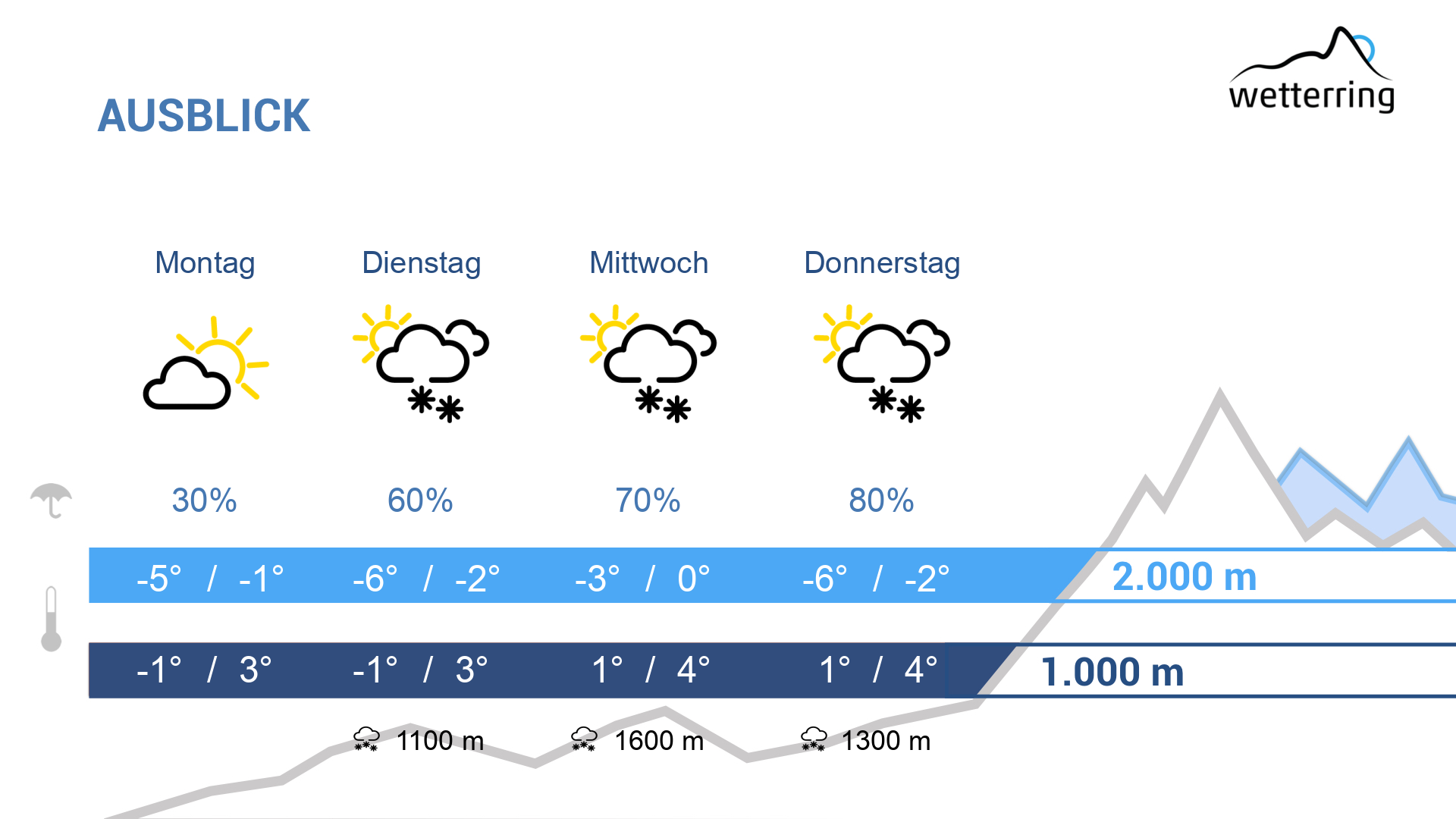 Auch am Donnerstag in den Tälern weiterhin mild mit weiterem Regen. In den Bergen kühlt es mit stürmischem Westwind etwas ab, sodass die Schneefallgrenze gegen 1200 m sinkt.