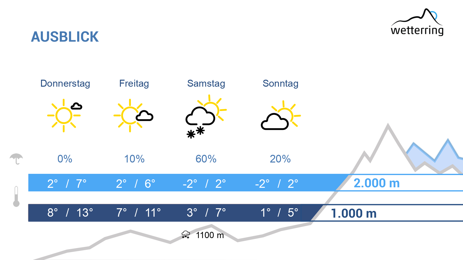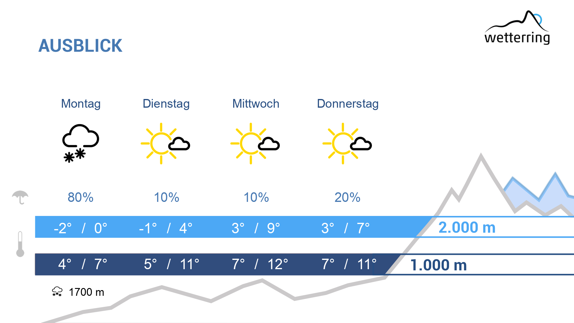 Die neue Woche beginnt wechselhaft. Vor allem in der ersten Tageshälfte des Montages ist es zeitweise nass, wobei oberhalb von rund 1500 Metern Schnee fällt. In den Bergen weht zudem stürmischer Westwind. Gegen Mittag klingen die Niederschläge weitestgehend ab und es lockert im weiteren Tagesverlauf zeitweise auf. Die Temperaturen erreichen Höchstwerte um 13 Grad in den Tälern und 0 Grad in 2000m Höhe. In der Nacht auf Dienstag ziehen bereits die nächsten Schauer auf.