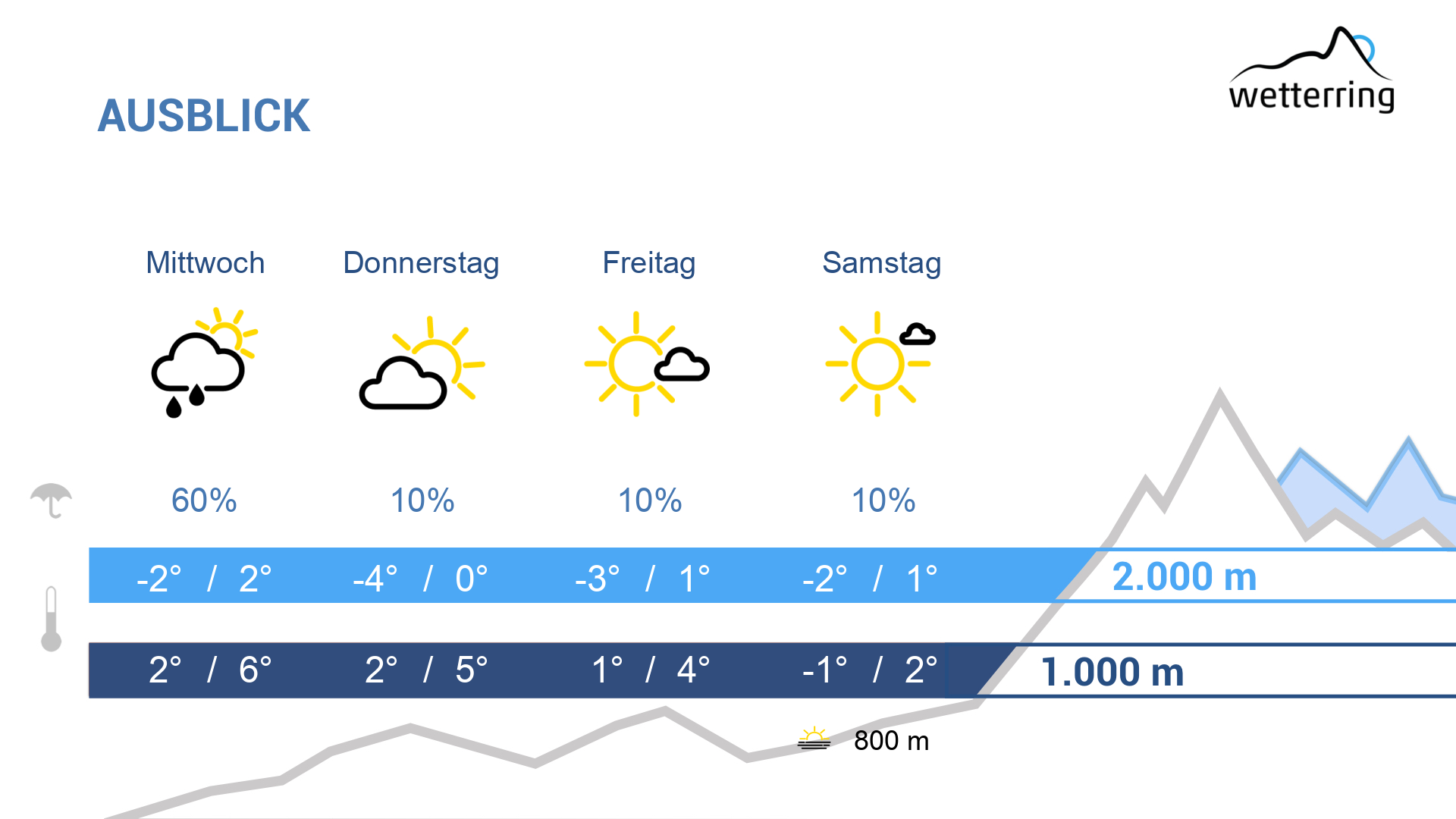 Die Störung ist Dienstags schon wieder abgezogen. Es lockert auf und es gibt einen freundlichen Mix aus Sonne und Wolken. Es ist deutlich wärmer, im Rheintal erreichen die Höchstwerte um die 8 Grad, die Nullgradgrenze liegt auf über 2.000 m. In den Nachtstunden könnte Nebel einfallen.