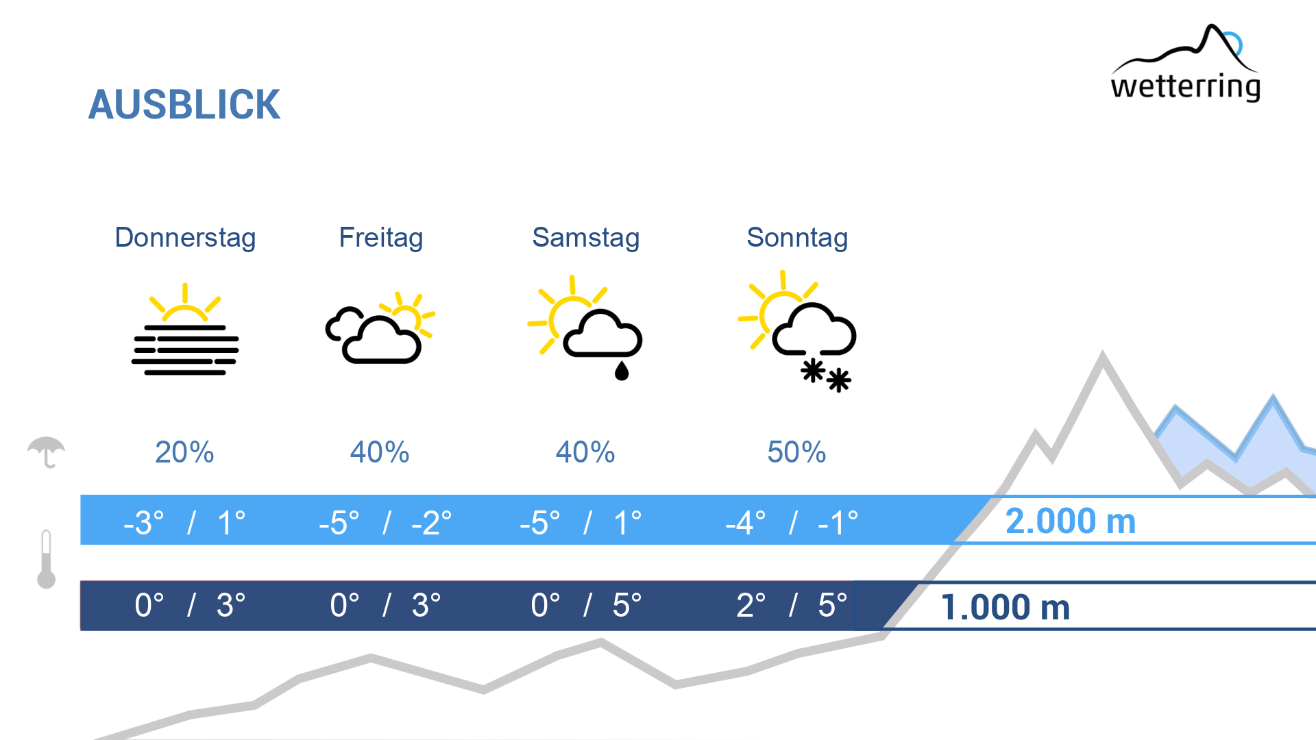 Am Sonntag streift uns eine schwache Front und bringt neben einigen Wolken vereinzelt auch kurze Regenschauer, wobei die Schneefallgrenze um 1.500 -1.800 m liegt.