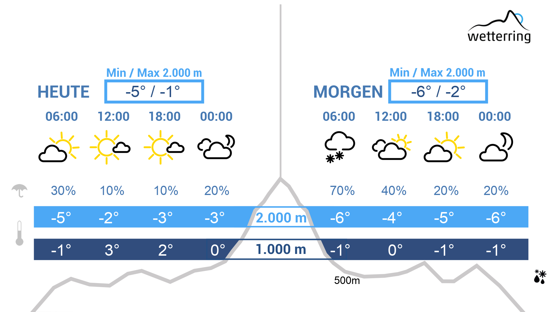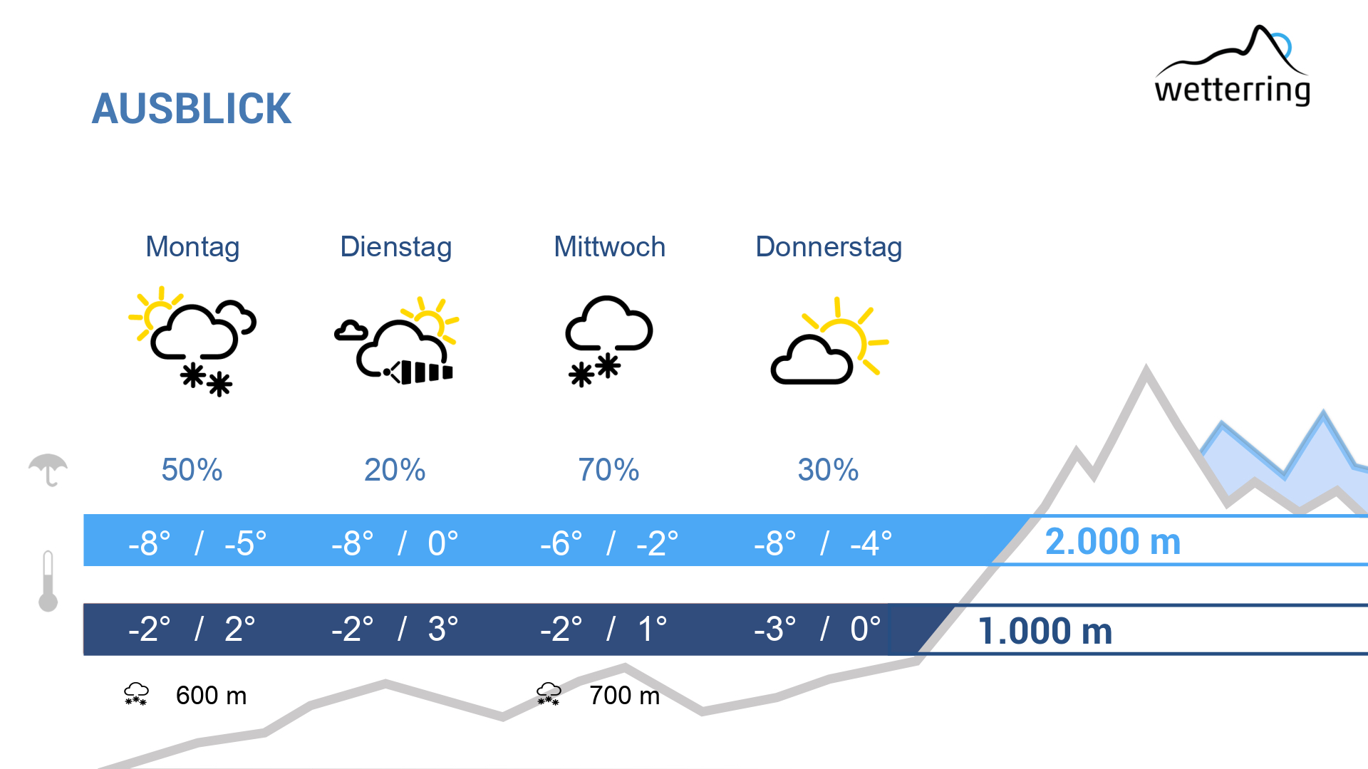 Am Mittwoch bricht der Föhn bereits in der Nacht zusammen und eine Kaltfront zieht auf. Diese sorgt in über den Tag verteilt immer wieder für Schauer, wobei oberhalb von 700-900 Metern einige Zentimeter Neuschnee fallen. Am Abend abklingende Schauer und zaghafte Auflockerungen.