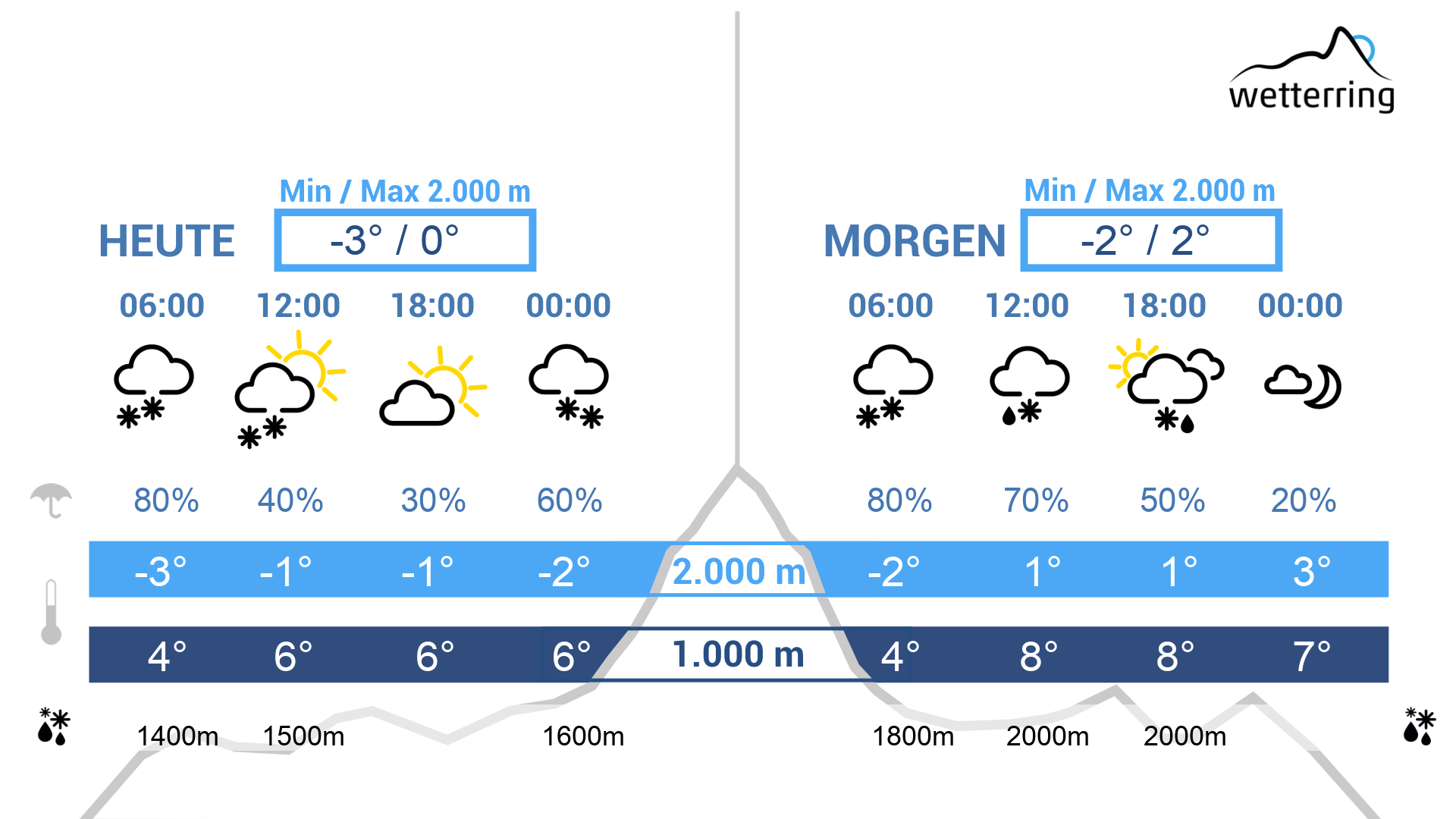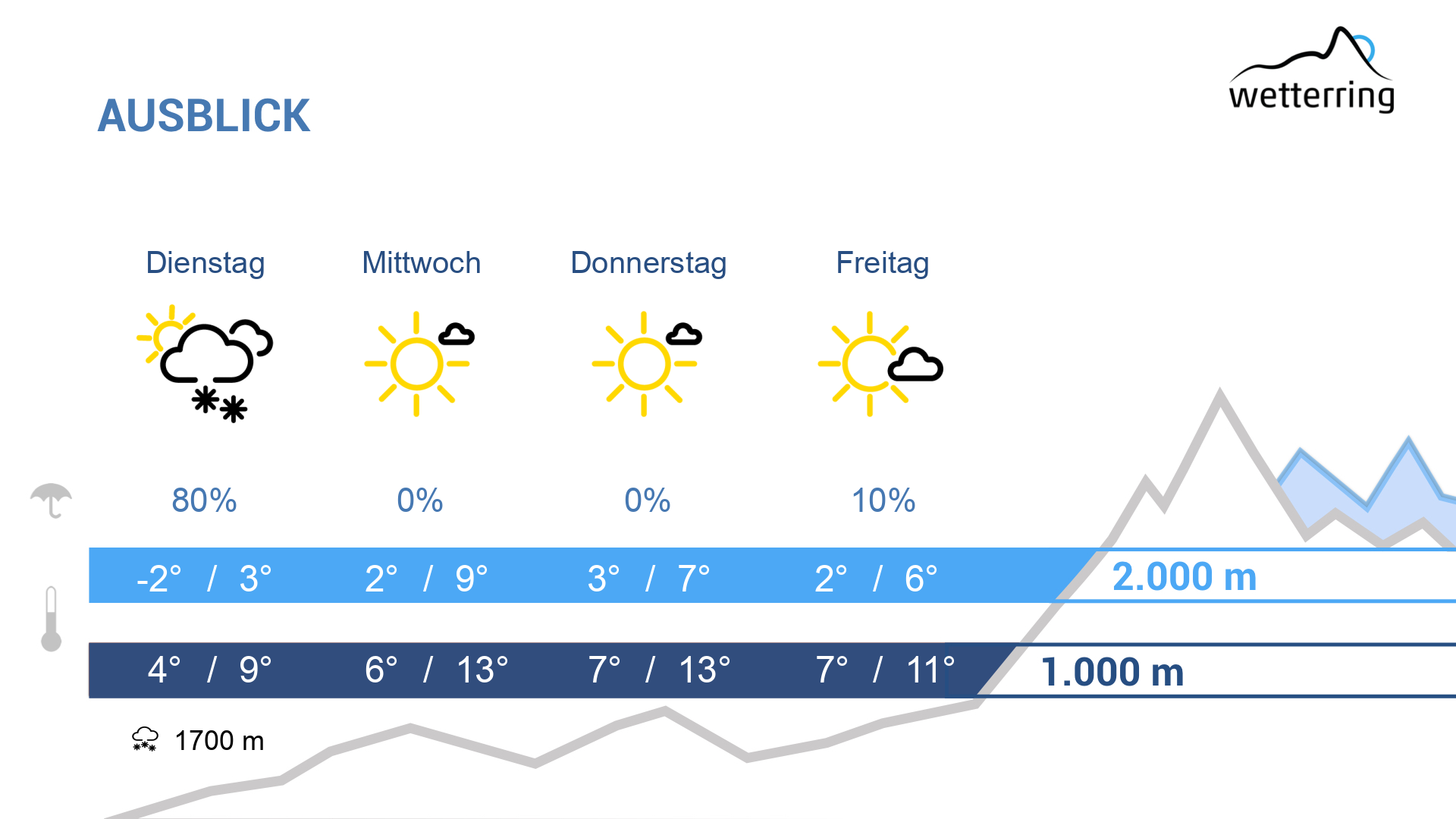 Am Mittwoch mit aufkommendem Hochdruckeinfluss und leicht föhnigen Verhältnissen deutliche Wetterbesserung und durchwegs frühlingshaft.Von früh bis spät dominiert dabei der Sonnenschein, es ziehen nur wenige harmlose Wolkenfelder vorüber. Dazu steigen die Temperaturen im Rheintal lokal auf bis zu 18 Grad und auch auf 2000 Metern wird es mit bis zu 9 Grad ausgesprochen mild.