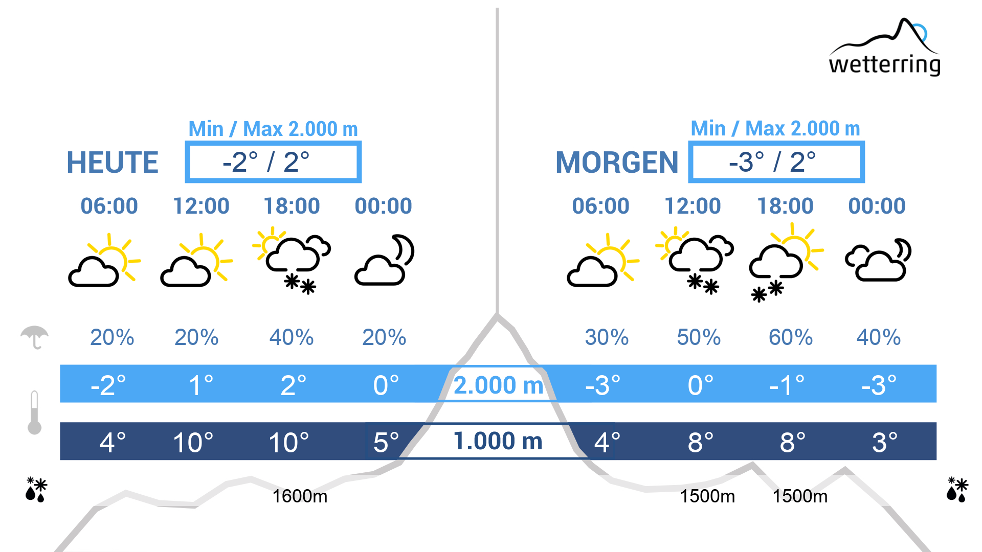 Am Montag wechseln sich ein paar dichtere Wolken mit sonnigen Phasen ab. Mit Schwerpunkt in den Bergen kommt es am Nachmittag zu vereinzelten Schauern, die Schneefallgrenze liegt dabei um 1600 m. Verbreitet bleibt es aber trocken. Die Temperaturen bleiben gedämpft mit maximal 17 Grad im Rheintal und 2 Grad in 2000 m Höhe.