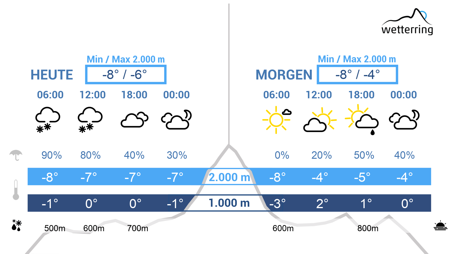 Am Donnerstag halten sich den ganzen Tag über dichte Wolken und besonders am Vormittag schneit es noch etwas in den Bergen, in ganz tiefen Lagen handelt es sich um Regen oder Schneeregen. Am Nachmittag lässt der Schneefall langsam nach, gleichzeitig steigt die Schneefallgrenze wieder auf 600-700 m. Der Abend verläuft dann oft schon trocken, mit letzten Schauern ganz im Norden.