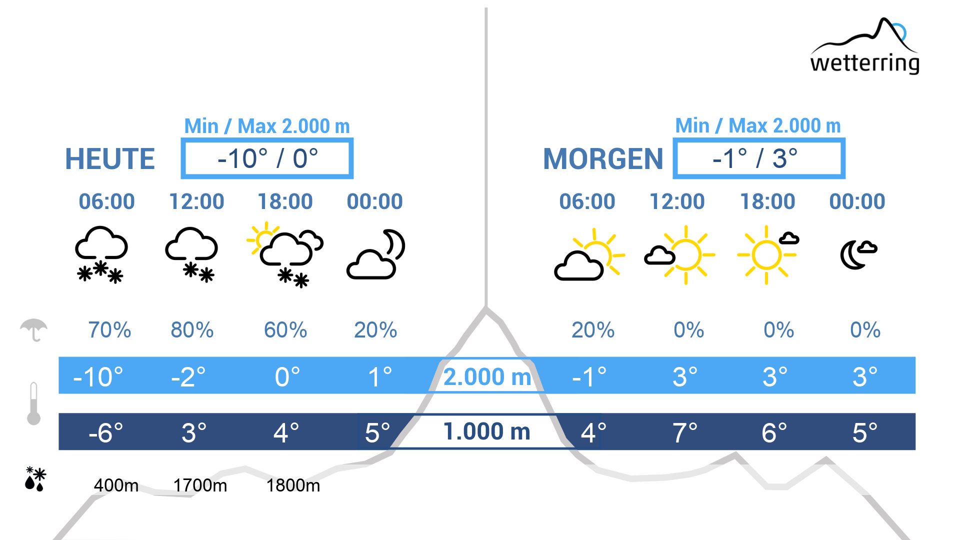 Der Montag startet eiskalt aber bereits bewölkt und es fängt bald an zu schneien. Da es eine Warmfront ist, geht der Schneefall bereits am Vormittag oft in Regen über. Bis zum frühen Abend regnet es vor allem in den Bergen. Die Schneefallgrenze liegt auf ca. 1.800 m. In der Höhe weht stürmischer Westwind.