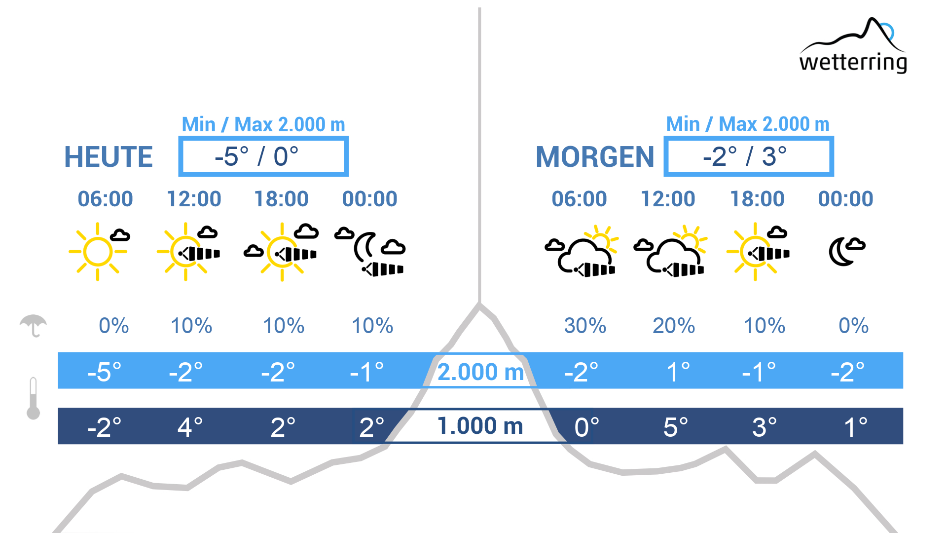 Am Mittwoch starten wir meist frostig in den Tag. Der Föhn schwächt sich ab. Am Vormittag wechseln sich sonnige und bewölkte Phasen ab und in den Bergen weht lebhafter Wind. Am Nachmittag trübt es sich ein mit etwas Schneefall in den Bergen bei einer Schneefallgrenze von ca. 1000m