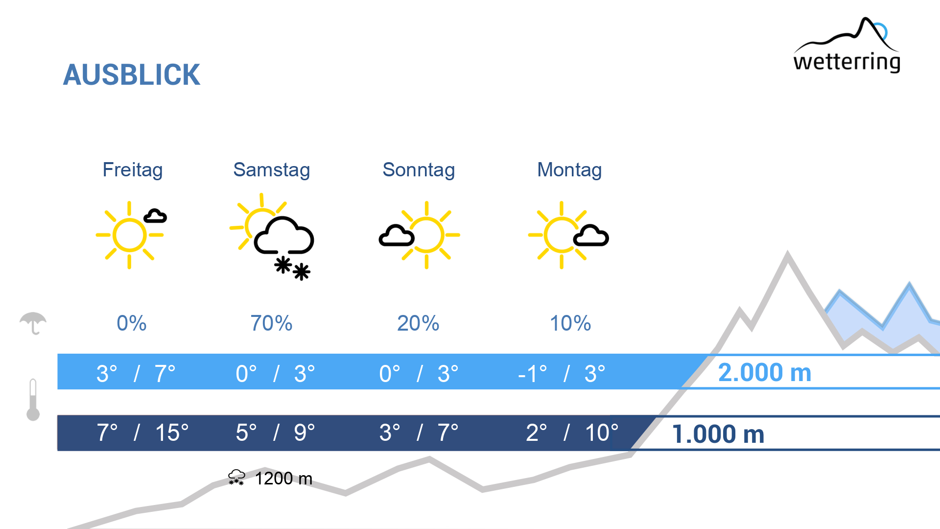Am Samstag allmählich etwas unbeständiger. In der Früh und am Vormittag scheint die Sonne noch zum Teil ungetrübt, ehe am Nachmittag allmählich Wolken einer schwachen Kaltfront aufziehen. Diese sorgt am Abend und in der Nacht auf Sonntag für einige unergiebige Schauer. Die Schneefallgrenze sinkt dazu langsam gegen 1500-1300 Meter ab.