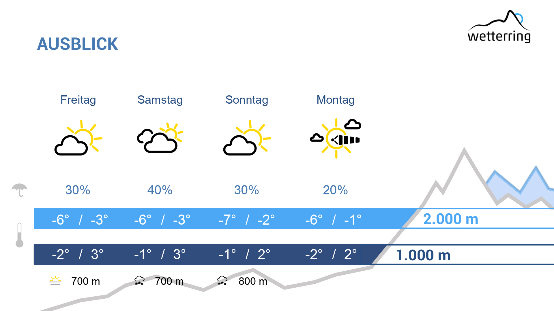 Am Sonntag wird es leicht föhnig mit Höchstwerten bis 7 Grad. Dazu gibt es eine Mischung aus dichteren Wolken und etwas Sonne.