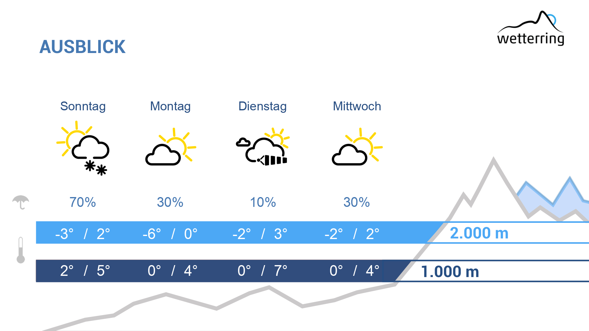 Am Mittwoch lässt die Föhnströmung allmählich nach, das Wetter bleibt aber durchwegs auf der freundlichen Seite. Zwar ziehen über den Tag hinweg immer mal wieder dichte Wolkenfelder vorüber, es bleibt bei Temperaturen um 5 Grad im Rheintal aber trocken.