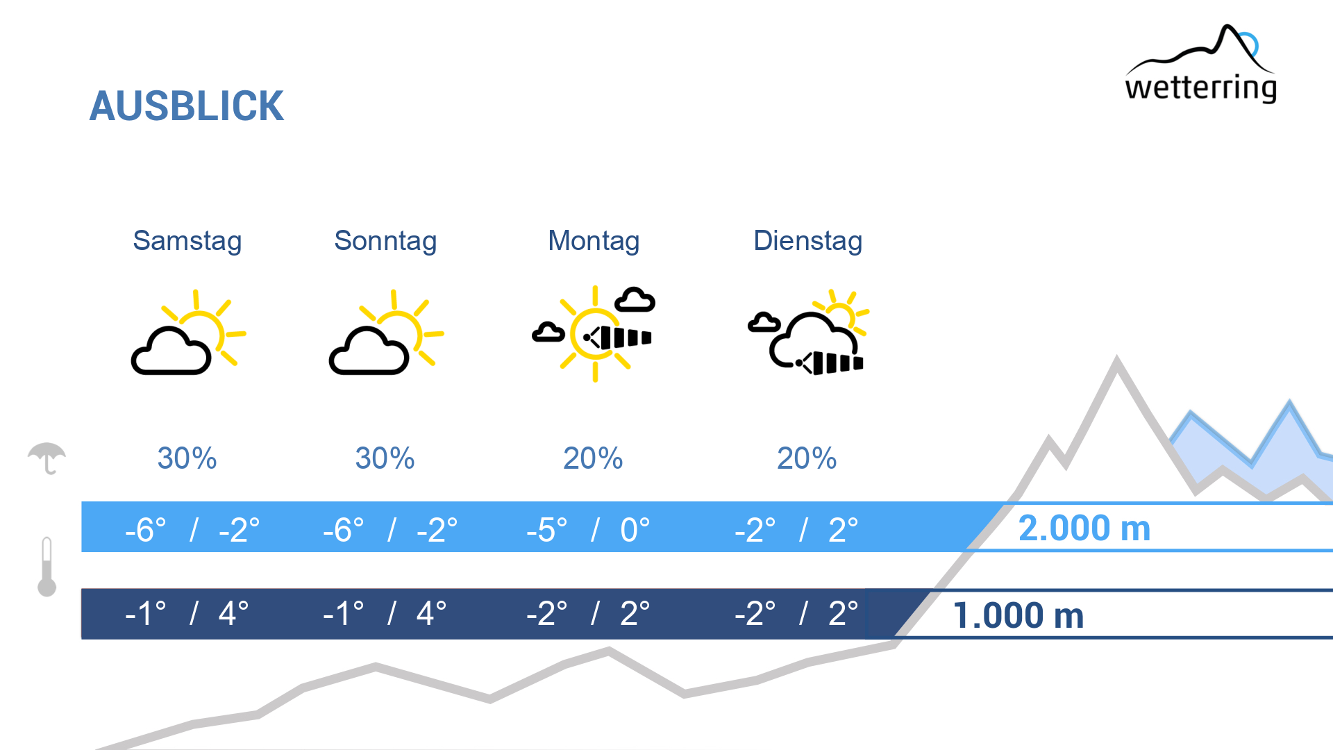 Der Montag wird überwiegend sonnig und mit teils stürmischem Südföhn auf den Bergen und in den Föhngebieten recht mild. Die Höchstwerte liegen meist zwischen 5 und 10 Grad.