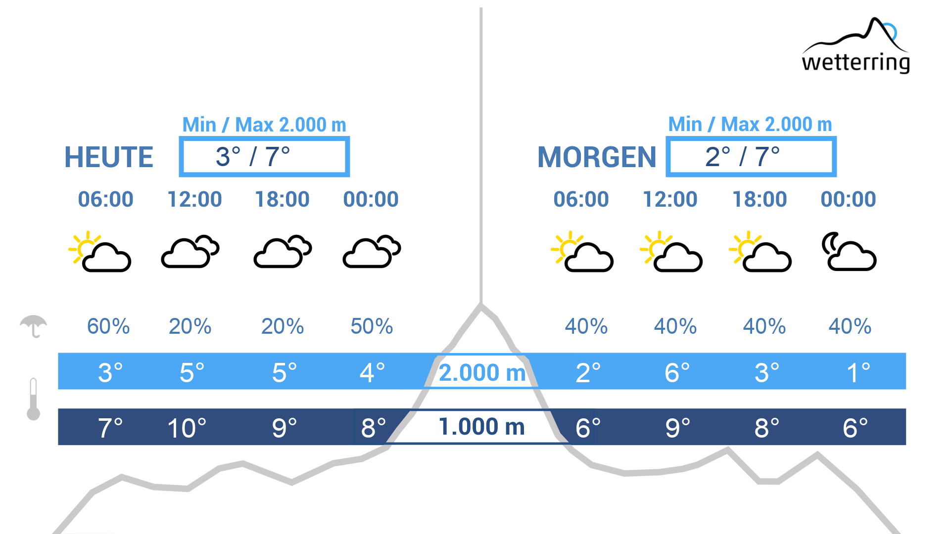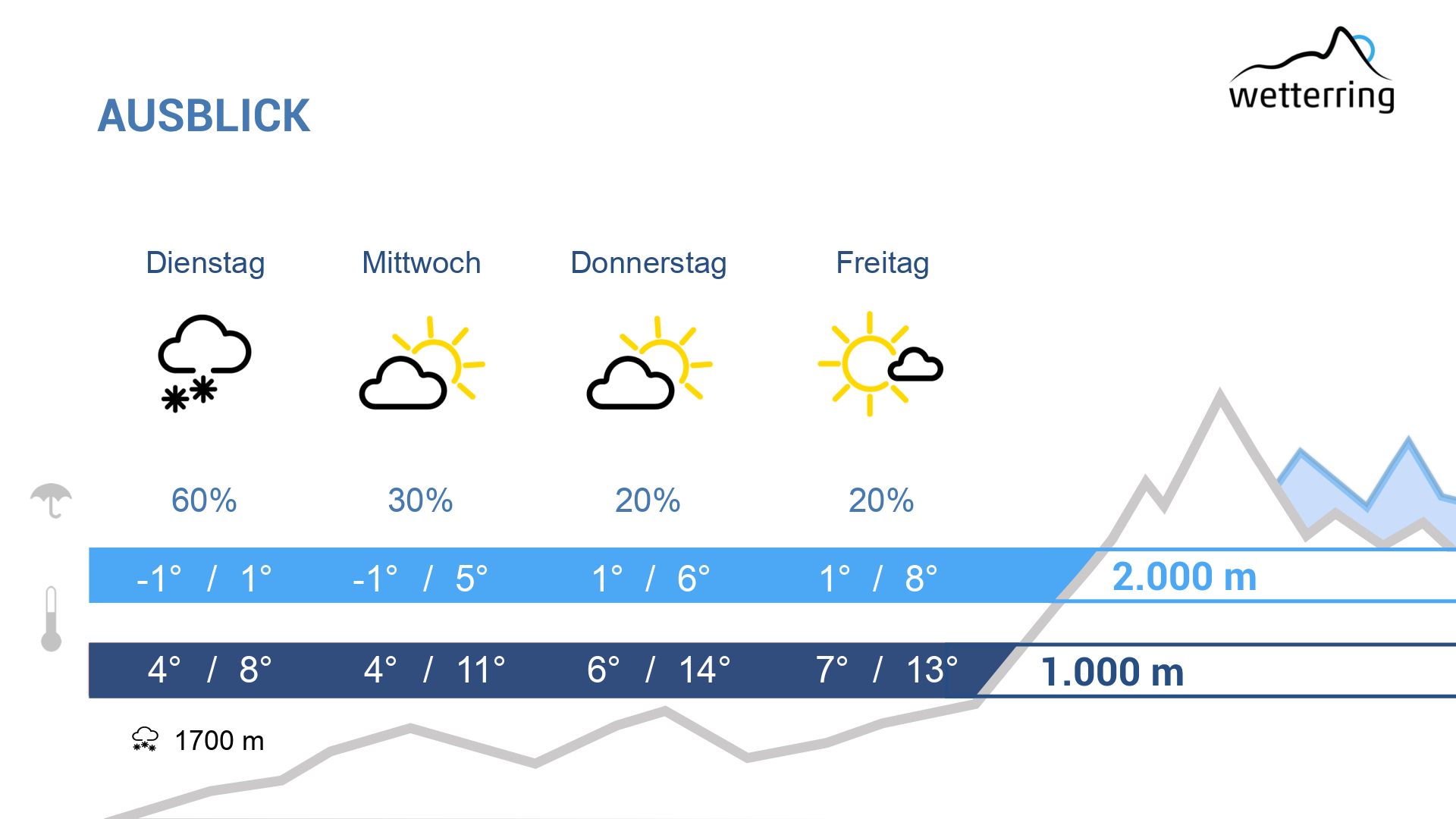 Der Freitag wird vermutlich der wärmste Tag der Woche mit 18-20 °C im Rheintal, wo es am meisten Sonnenschein gibt. In den Bergen zunächst sonnig, später Abschattung durch Quellbewölkung.