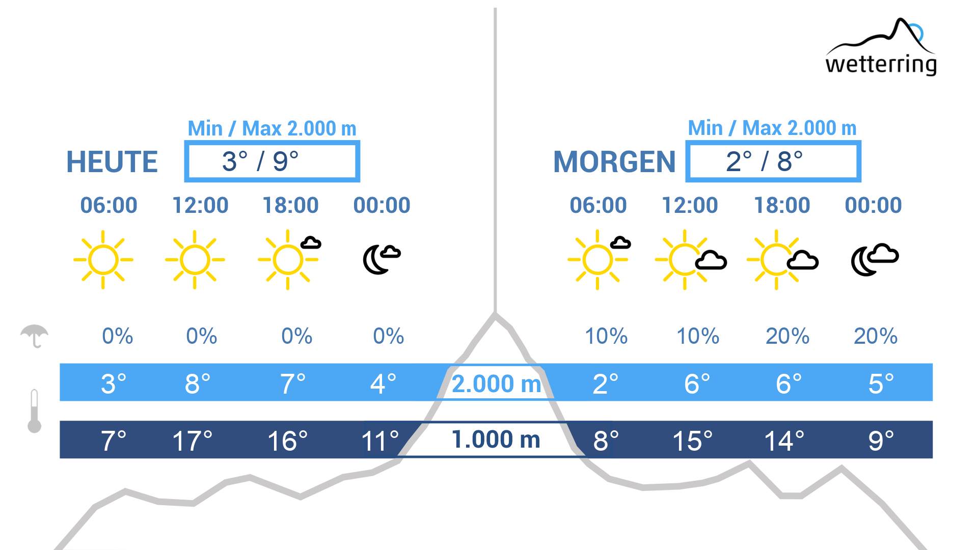 Der nächste sonnige und milde Frühlingstag steht bevor. Von der Früh weg scheint die Sonne. Tagsüber ziehen höchstens ein paar harmlose dünne Federwolken durch, ansonsten bleibt es sonnig. Die Temperaturen steigen am Nachmittag auf bis zu 23 Grad in den Tälern und bis zu 10 Grad in 2.000m Höhe.