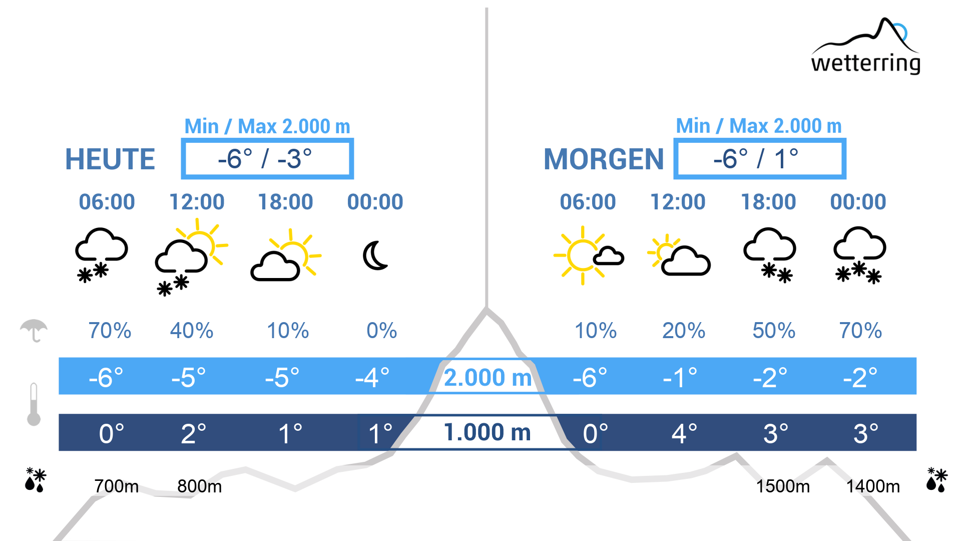 Am Sonntagvormittag oft noch nass mit Regenschauern, wobei die Schneefallgrenze um 1.500 -1.700 m liegen dürfte. Am Nachmittag kurze Niederschlagspausen, die Wolken überwiegen.