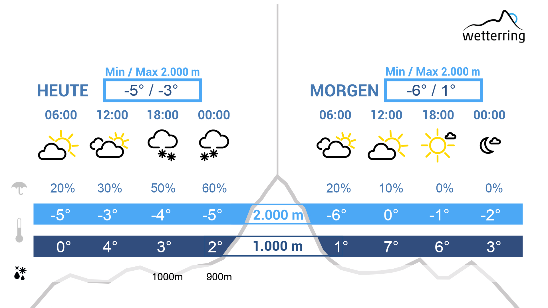Nach nächtlicher Schauer mit etwas Neuschnee auf unter 1.000 m, lockert es langsam auf und in den Bergen setzt Föhn ein. Insgesamt ein freundlicher Tag.