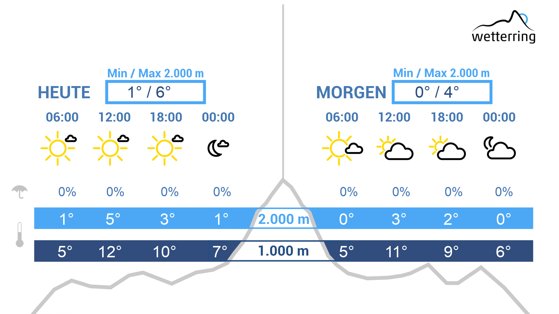 Es bleibt recht sonnig, aber nicht mehr ungetrübt. Ausgedehnte Schleierwolken können die Sonne zeitweise abschwächen. Die Temperaturen ändern kaum mit Höchstwerten von bis zu 17 Grad in den Niederungen und um 4 Grad auf 2000 m. In der Höhe bleibt uns der schwache Süd- bis Südwestwind erhalten.