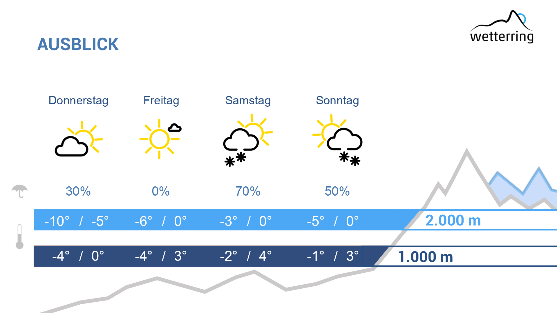 Am Donnerstag deutliche Wetterbesserung. In der Früh fallen aus dichten Wolken hie und da noch letzte Flocken, im weiteren Tagesverlauf lockern die Wolken aber immer öfter auf. Mit der einen oder anderen Sonnenstunde steigen die Temperaturen im Rheintal noch bis auf rund 4 Grad an, womit es dem Schnee in tiefen Lagen bereits wieder an den Kragen geht. Im Gebirge oberhalb von 1000 Metern herrscht dagegen Dauerfrost.