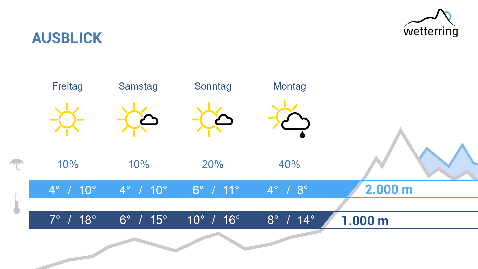 Trocken und sonnig geht es weiter. Es wird noch eine Spur milder - aus heutiger Sicht könnte sich verbreitet ein Sommertag (Temperaturen >= 25 Grad) ausgehen. Auch in 2000 m sind bis zu 10 Grad möglich.