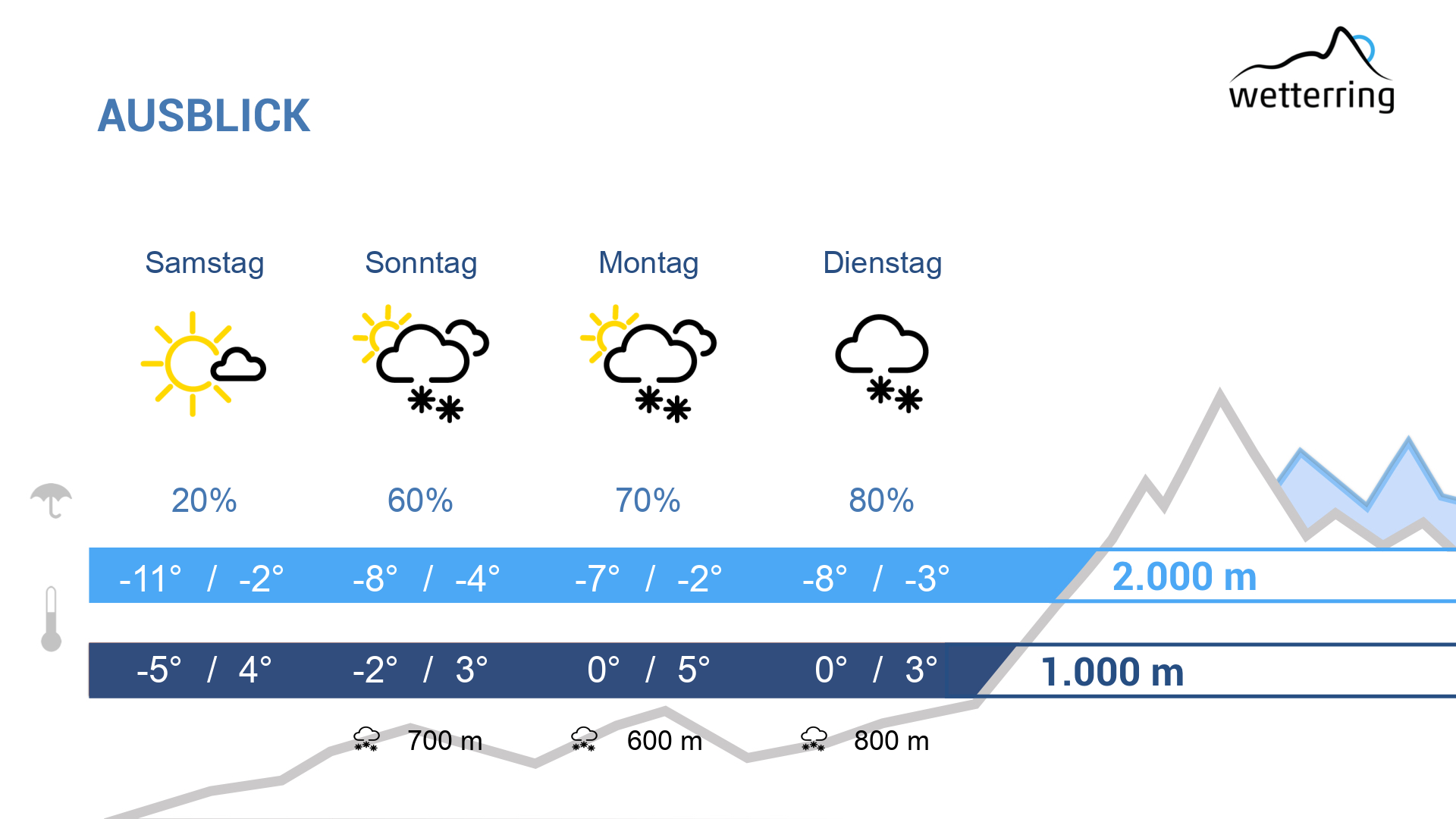 Aus heutiger Sicht gibt es einen Mix aus dichten Wolken, einzelnen Auflockerungen sowie tagsüber auch kurze Schnee-, Graupel- und Regenschauern. Je nach Intensität der Niederschläge liegt die Schneefallgrenze um 500-800m.