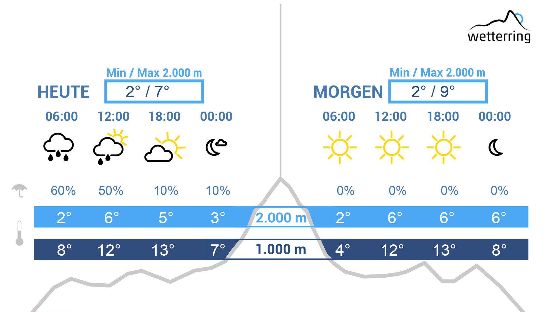 Am Mittwoch dominieren in der ersten Tageshälfte meist dichte Wolken den Himmel. Im Süden kann es vereinzelt auch etwas regnen. Vielerorts bleibt es allerdings meist ganztägig trocken. Am Nachmittag beginnt es mit zunehmender Bise langsam aufzulockern. Die Höchstwerte steigen erneut auf bis zu 19 Grad in den Tälern und maximal 7 Grad in 2000m Höhe.