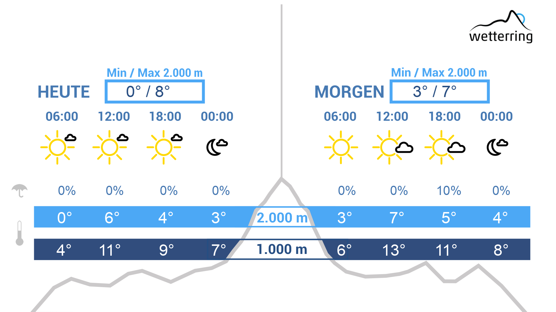 Am Donnerstag freundliches Hochdruckwetter und vorfrühlingshaft mild mit Höchstwerten bis zu 16 °C im Rheintal und selbst in 2.000 m bis zu 6 Grad. Dazu im Gebirge leicht föhnig. Schwacher bis mäßiger Südwind im Gebirge. Mit der Südströmung wird Saharastaub bis zu uns transportiert, wodurch der Sonnenschein im Tagesverlauf etwas getrübt wird.