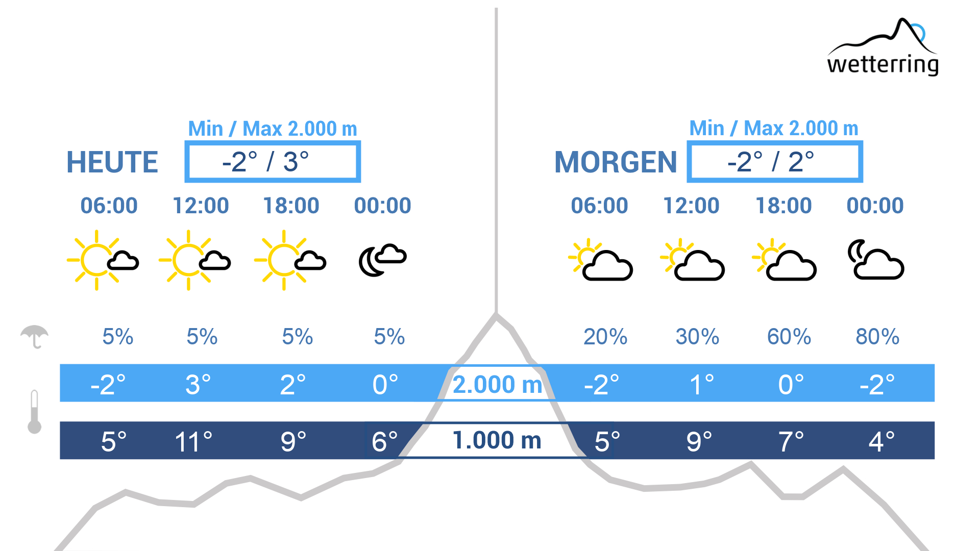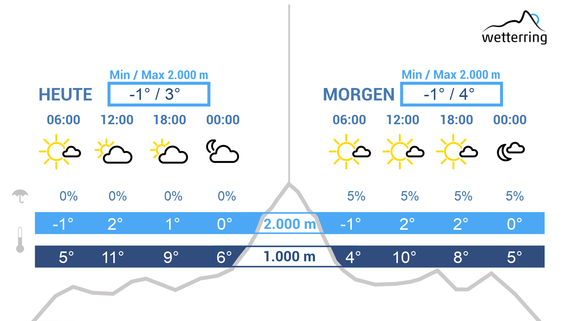Der Donnerstag startet bewölkt mit ein paar Regentropfen (oberhalb von 1200-1400 m Schneeflocken). Ab Mittag immer mehr sonnige Abschnitte. Mit dem Sonnenschein bis zu 13 Grad im Rheintal und um 0 Grad auf 2000 m Höhe.