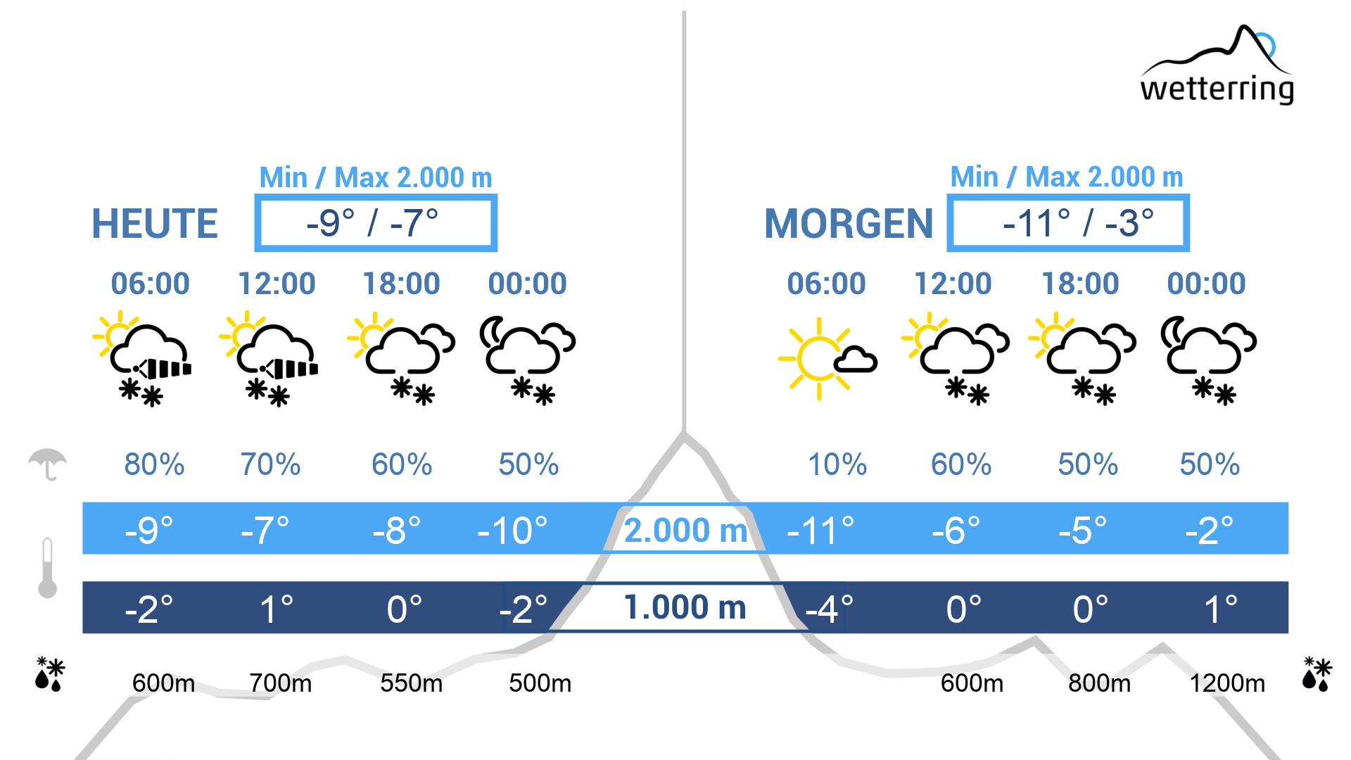 Nach einem kurzen Föhnintermezzo in den frühen Morgenstunden bricht der Südwind langsam zusammen und wird von dichten Wolken und aufkommenden Niederschlägen abgelöst. Untertags allmählich kühler und somit sinkende Schneefallgrenze.