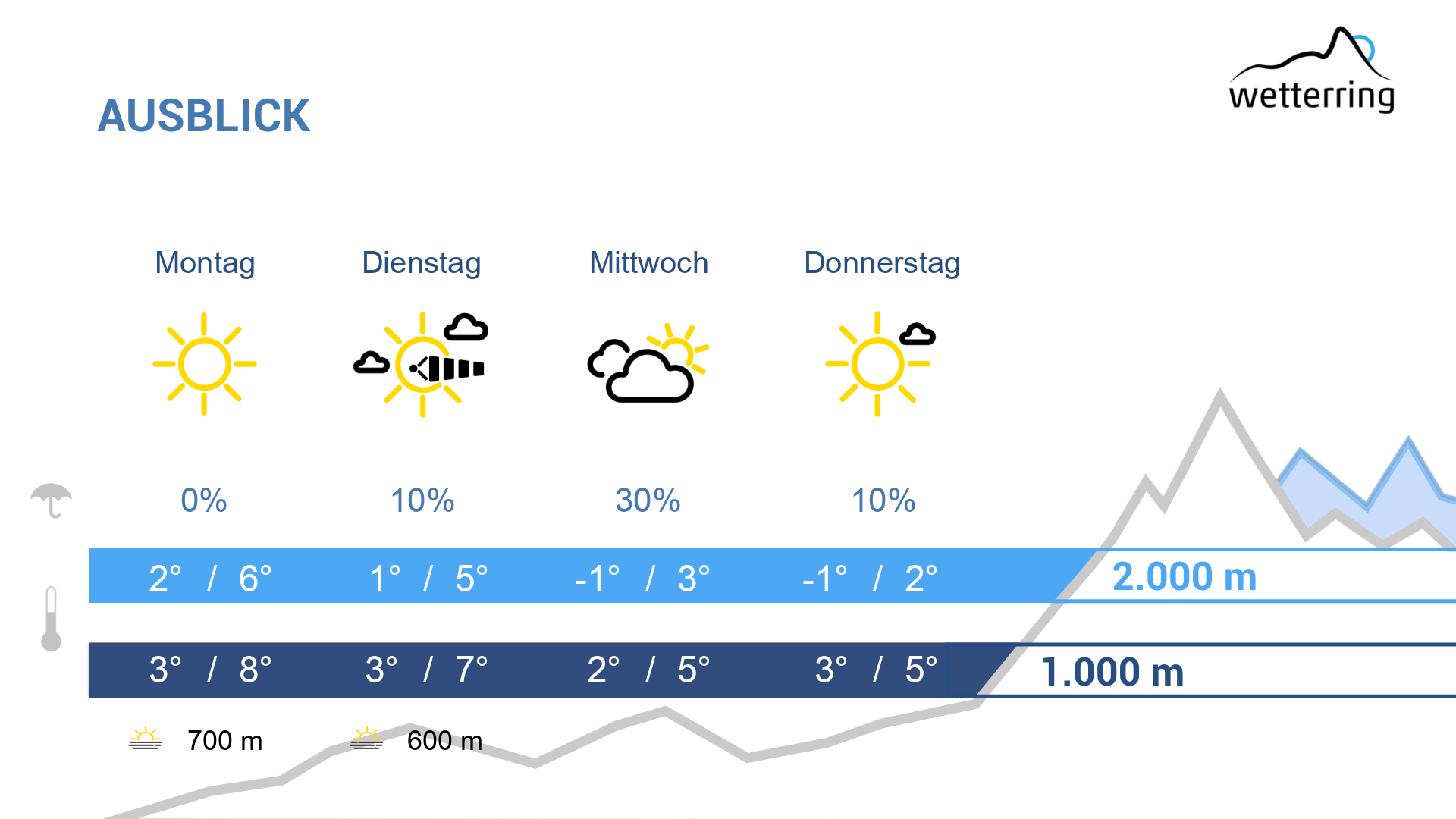 Die neue Woche bleibt vorerst bei Hochdruckwetter. Es gilt auch hier: oben hui, unten pfui. Auf 1.500 m herrscht Kaiserwetter bei 7 Grad und toller Fernsicht. Am Nachmittag kommt in den Bergen leichter Südwind auf und es ziehen die ersten Schleierwolken auf.
