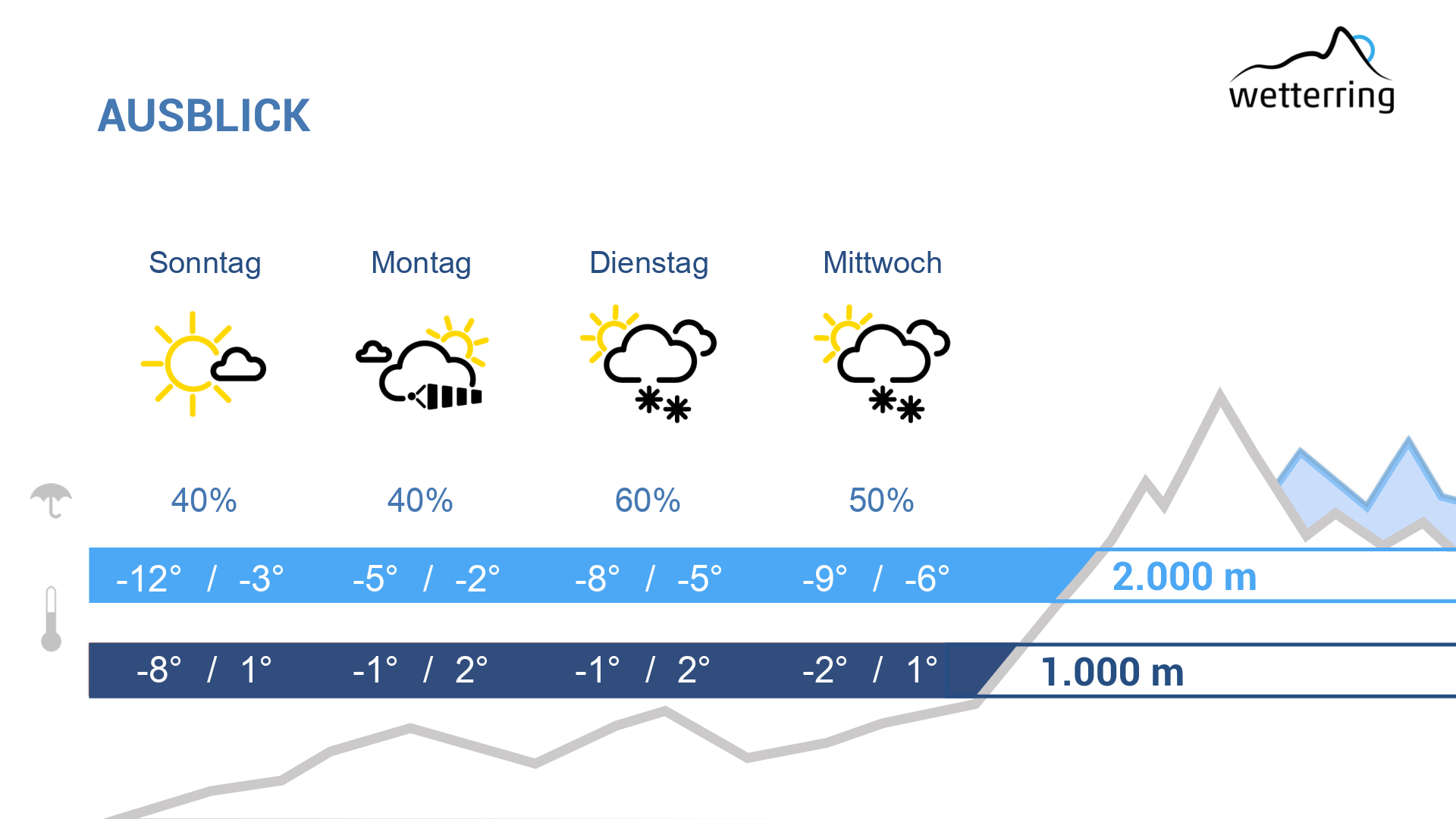 Der Dienstag bringt ruhiges Wetter. Meist ist es stark bewölkt mit nur wenigen Auflockerungen. Die Temperaturen gehen wieder etwas zurück und erreichen bis zu 4 Grad in den Tälern und max. -4 Grad in 2000m Höhe.