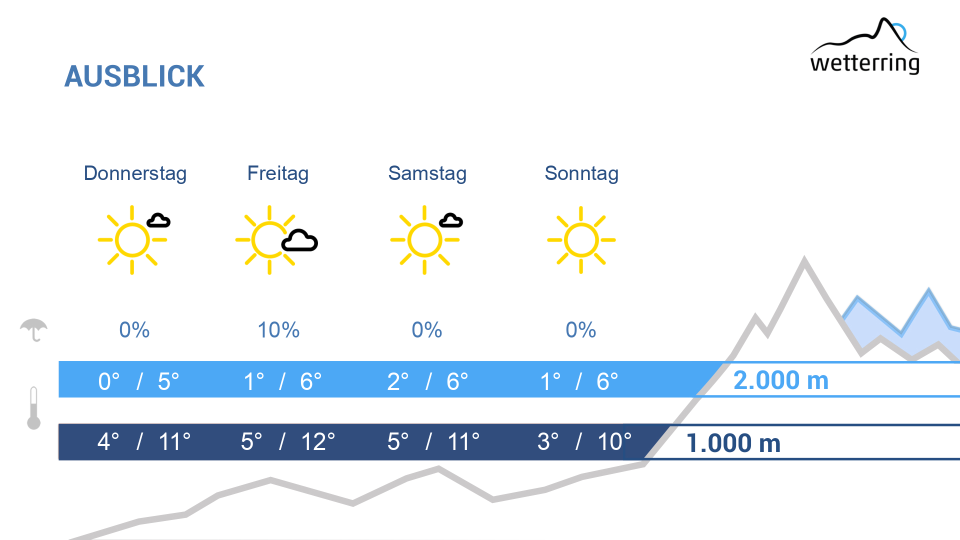 Am Donnerstag ungetrübt sonniges Hochdruckwetter und frühlingshaft mild mit Höchstwerten bis zu 16 °C im Rheintal.
