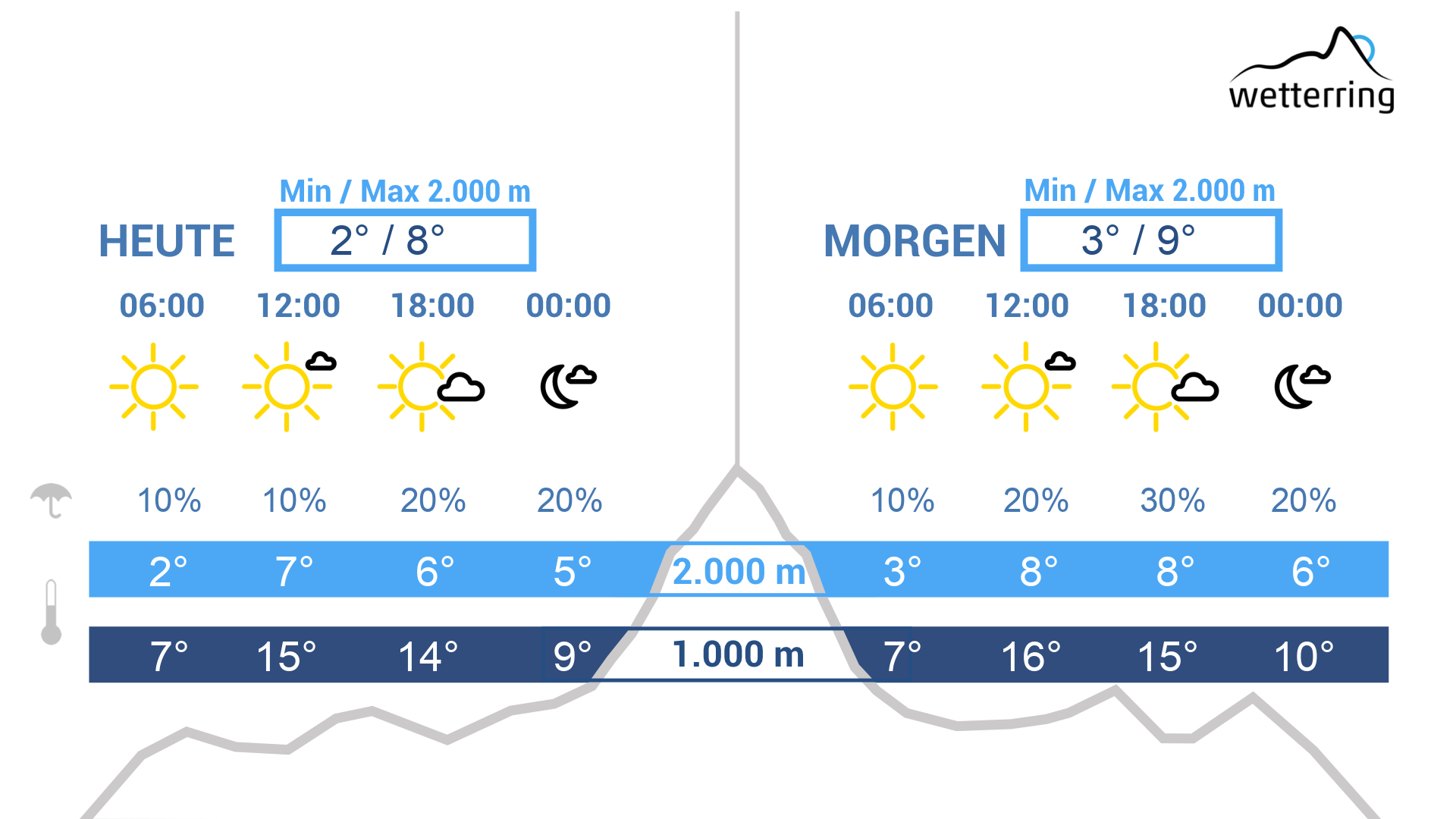 Das ruhige Frühlingswetter hält weiter an. Allerdings bilden sich tagsüber vor allem über den Bergen größere Quellwolken. Ganz vereinzelt bringen diese hier einzelne Schauer oder ein paar Regentropfen. Abseits davon bleibt es weitgehend trocken und überwiegend sonnig. Die Temperaturen steigen am Nachmittag auf Werte um 21 Grad und bis zu 8 Grad in 2.000m Höhe.