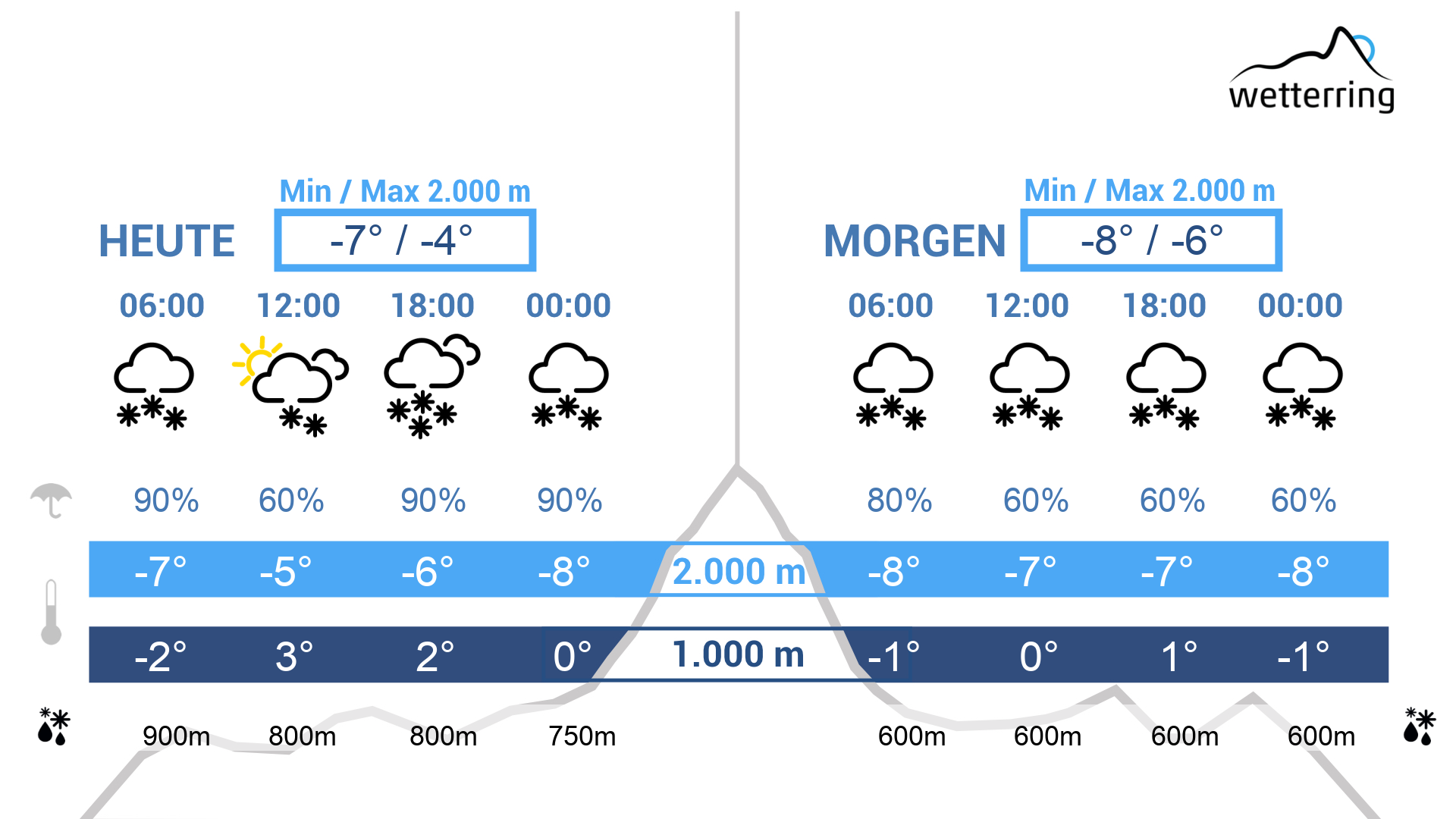 Heute, windig, viel Schnee in den Bergen