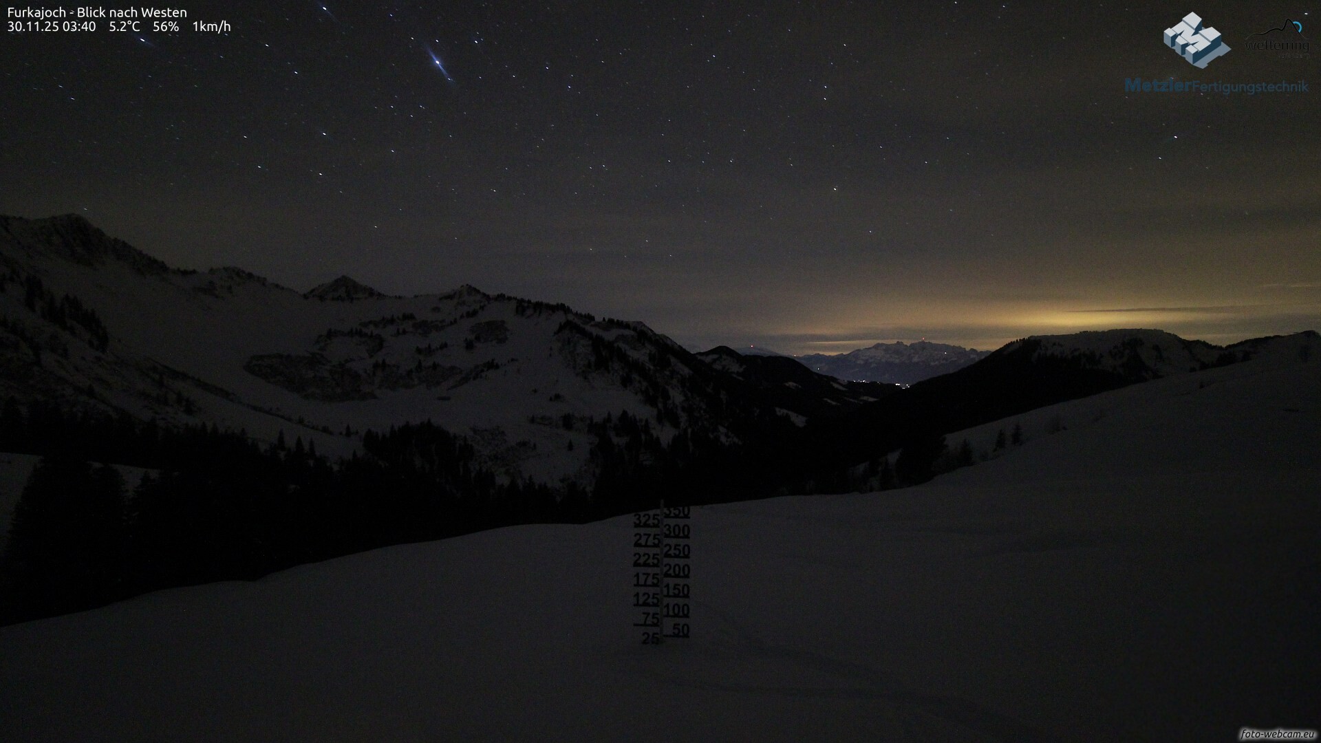 Im Verlauf des Abends trifft eine schwache Kaltfront ein. Diese bringt über Nacht etwas Niederschlag, wobei die Schneefallgrenze von 1300 auf etwa 800 Meter absinkt. Mehr als 2-5 cm Neuschnee kommen aber auch in den höheren Gebirgslagen nicht zusammen.